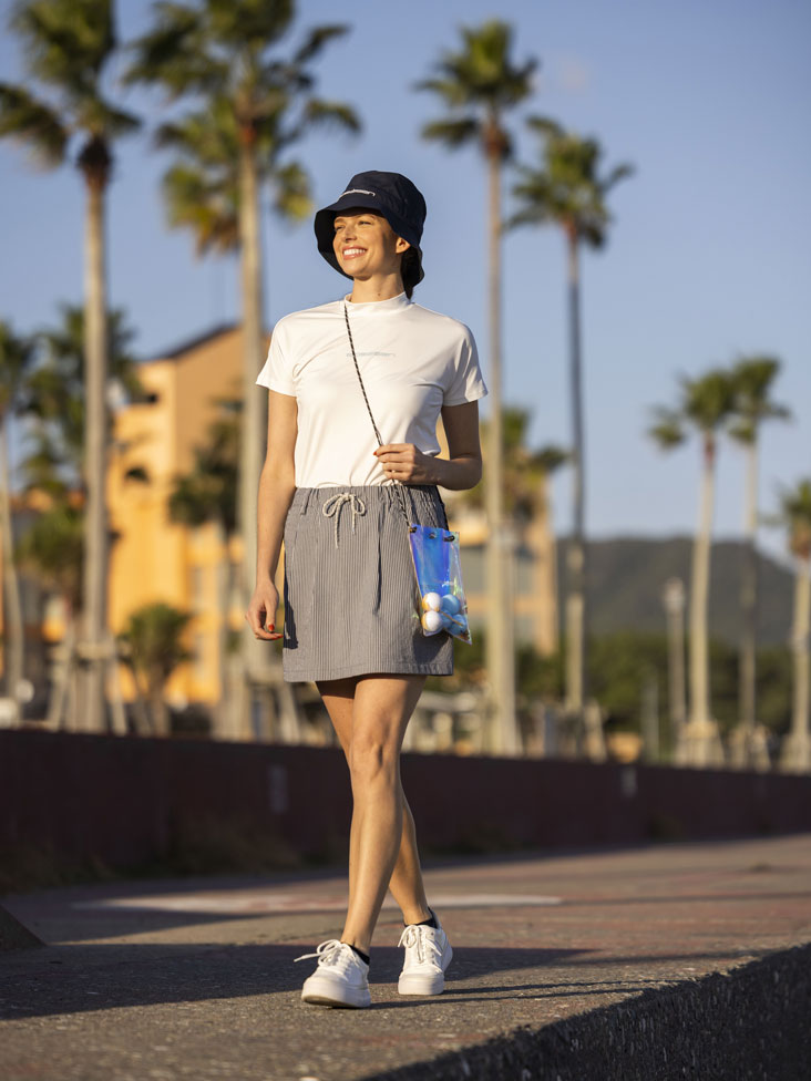 夏の打ち出し企画『オアシスリゾート』企画のシャツとタック入りのふんわりスカートのスタイル。シャツは、水分を蒸発させることにより冷却する気化熱冷感と吸水速乾・ストレッチ機能を併せ持ち、シーズン企画である風景画をバックプリントし、ネーミングからも涼しさがうかがえるエコクールコア素材を使用。スカートはストレッチが効いたエコでドライタッチな素材を使用。スポーティーなシャツに女性らしい柔らかなシルエットのスカートでロサーセンらしい程よいリラックスカジュアル感のあるコーディネート。サコッシュ付きのバケットハットもコーディネートのポイントに。