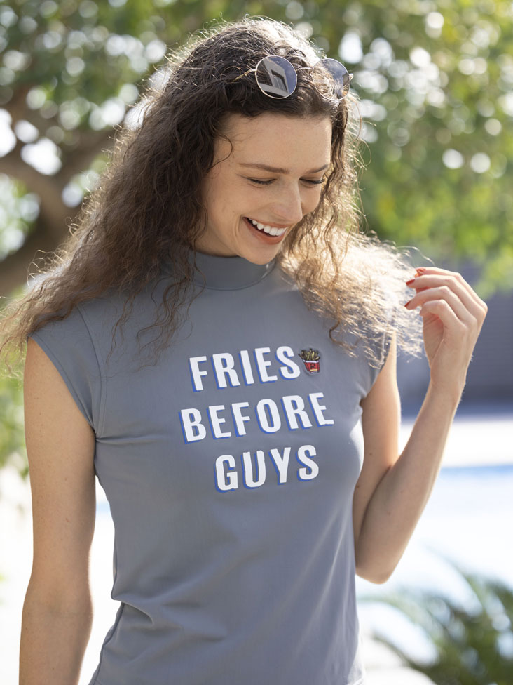 トップスはフライドポテトに因んだ”FRIES BEFORE GUYS"の文字と手書き風のポテトの刺繍を施したアイテムです。ノースリーブに肩の日焼けが気にならないようショルダーパーツがデザインポイントです。スカートはプリーツがポイントの動きのあるデザイン。発色も良く元気なコーディネートです。