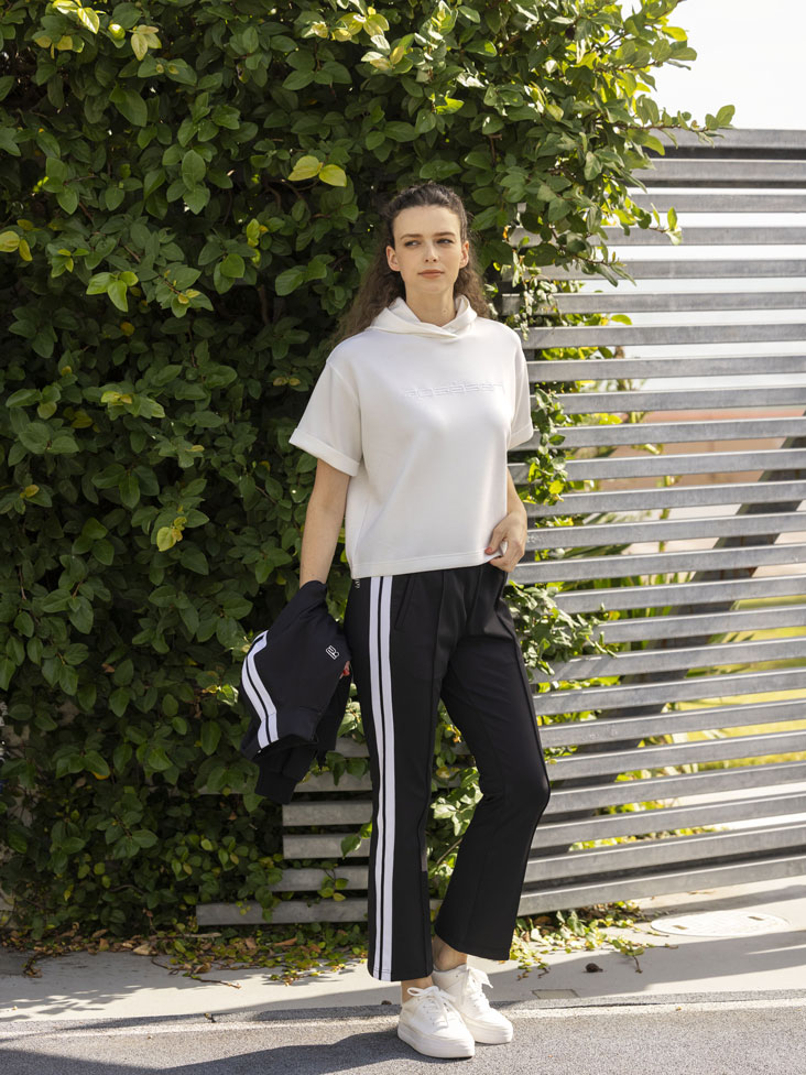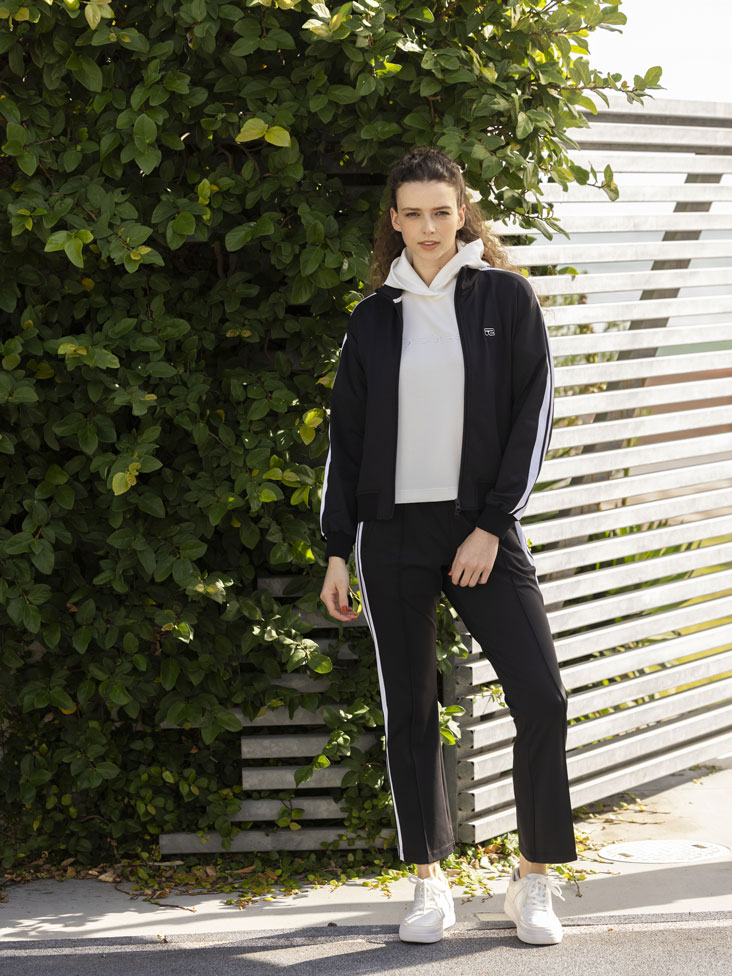 このセットアップは、サテン調の上品な光沢のあるジャージを使用して作られています。肌触りも心地よく、縦横に伸びるストレッチ性があり、ストレスを感じることなく着用できます。また、サイドラインのデザインが施されており、コーディネートしやすいアイテムに仕上げられています。さらに、インナーには空気を含んだダンボールニットの生地を使用したハーフスリーブのフーディーも組み合わせています。肌触り、生地の質感、柔らかさ、すべてがぴったりとマッチし、最高の着心地の商品となっています。フロントには同色で立体的な刺繍が施されており、ブルゾンを脱いだ時のバランスも素晴らしいコーディネートです。
