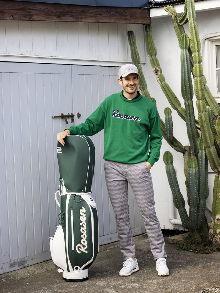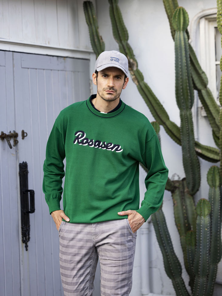 起毛した温かみのあるロゴニットとチェックコーデュロイのコーディネート。