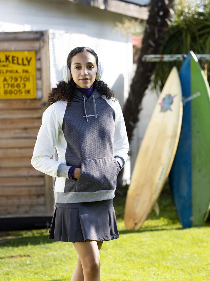 パーカーは身頃とフードに裏起毛加工により保温性を出した変形鹿の子素材を、袖は撥水・ストレッチ機能を持つ柔らかいタフタを使用し、中綿&キルトステッチを入れより暖かさを訴求。スカートは、撥水・防風・保温・ストレッチ機能を併せ持つ素材を使用し、女性らしさを演出するサイドプリーツがポイント。カジュアルと女性らしさをミックスさせたロサーセンらしいスタイル。パーカーは袖と同素材の中綿キルトパンツとのコーディネートもお勧め。