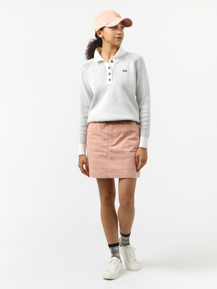 秋らしい素材を組み合わせたピンクスタイリング。大きめのボタンがポイントのニットポロは、異なる色の糸を組み合わせシャンブレー調に表現。スカートはカッティングでチェック柄を表現したコーデュロイスカート。キャップも同素材で合わせての着用がおすすめです。