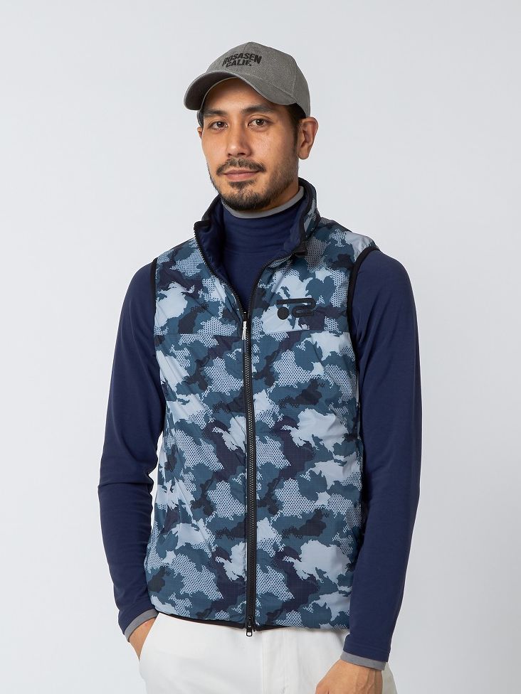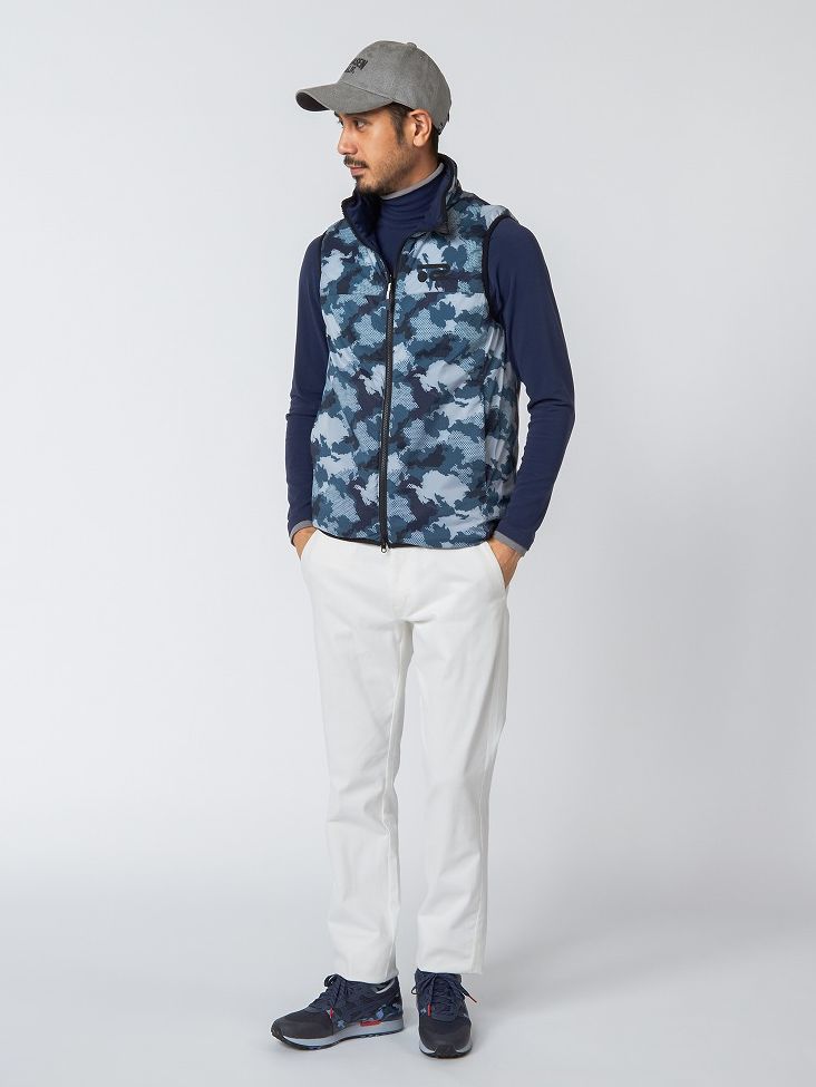 ネイビーのカモフラージュが特徴のベストをメインにスタイリング。カジュアルな柄なので、ハイネックのインナーやスウェード調のキャップを合わせ、大人っぽい印象に。ベストはリバーシブル仕様で爽やかな無地のブルーにもなるので、気分やシーンに合わせスポーティなスタイリングにすることも。