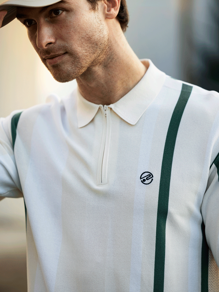 トップスのポロシャツは、ニットながら通気性に優れた夏でも快適なサマーウエア。