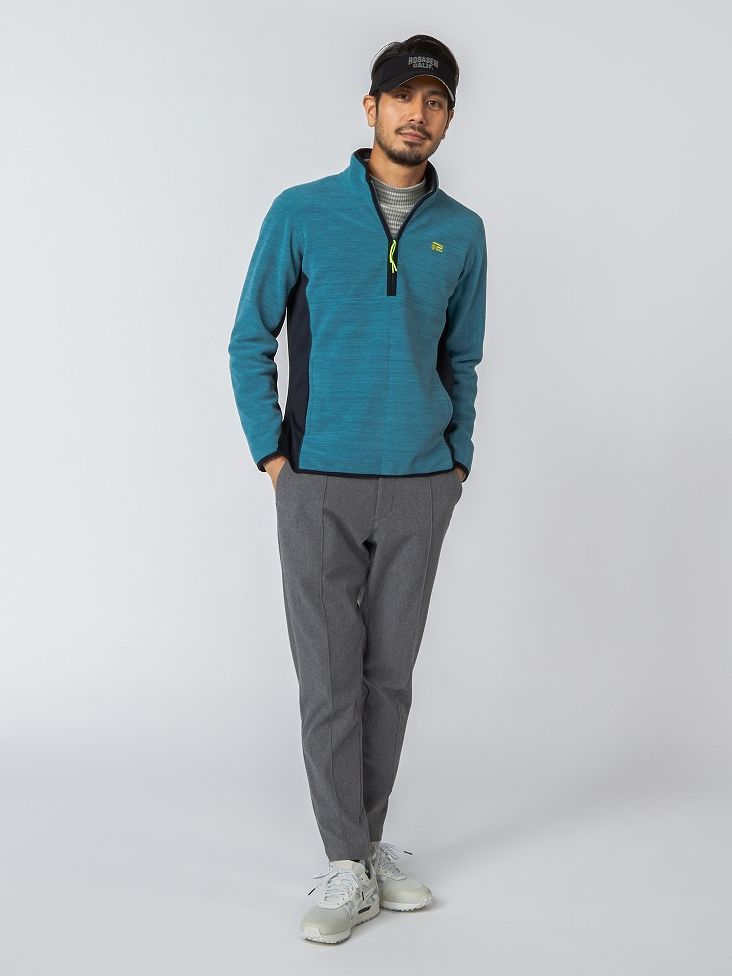 スポーティなデザインのプルオーバーにあえてクラッシクなウール調のピンタックパンツを合わせたミックスコーデ。パンツは少しゆったりとしたテーパードタイプでトレンド感のあるシルエット。プルオーバーの素材はテクノパイルと呼ばれるイタリアのポンテトルト社のフリースを使用。通常よりも目を詰めることで、保温性と防風性を向上させた機能素材。