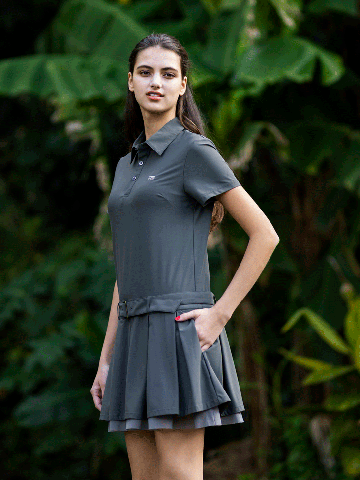 ウエスト位置を低めに設定した、メリハリのあるシルエットが美しい一枚。トップス部分はシンプルなポロシャツデザインで、上品かつきちんと感のある印象を与えます。スカート部分は、プリーツが華やかさを演出しつつ、動きやすさも抜群です。