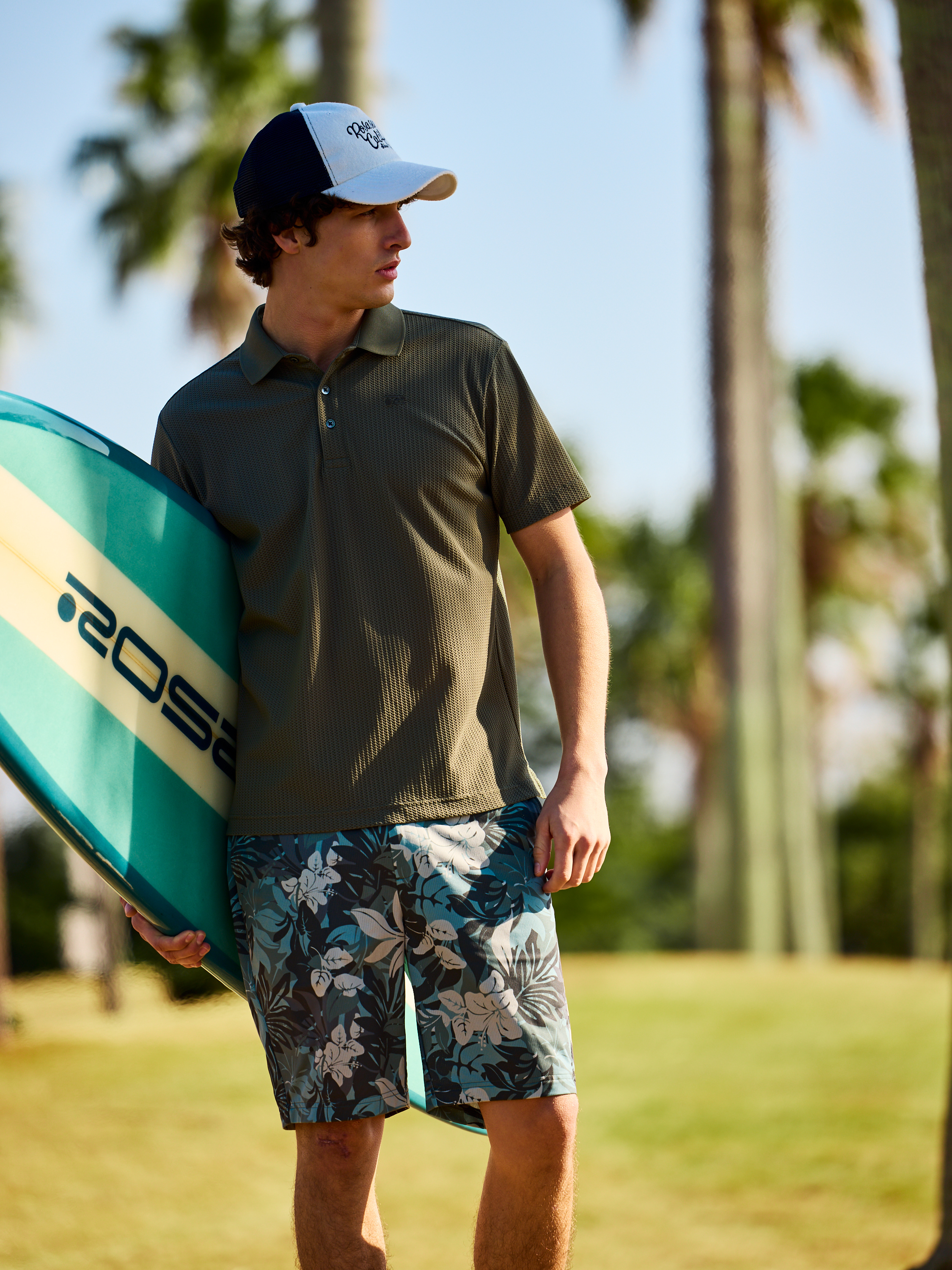 通気性に優れたディンプルメッシュ素材のカーキポロシャツに、ボタニカル柄の迷彩ショートパンツを合わせた夏らしいコーディネート。さらっとした肌触りと接触冷感で暑い日も快適に過ごせます。落ち着いた色味のトップスが柄パンツを引き立て、ゴルフからリゾートまで映えるアクティブなスタイルです。