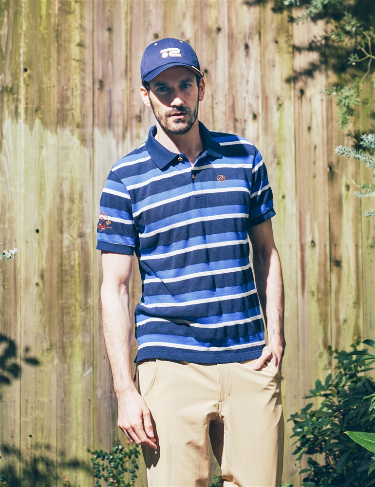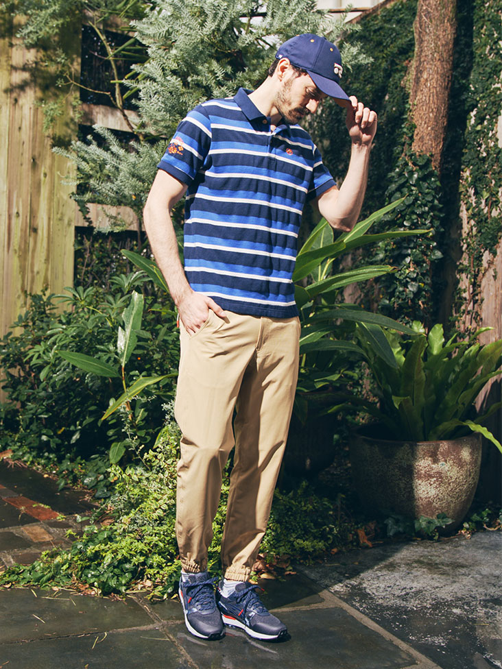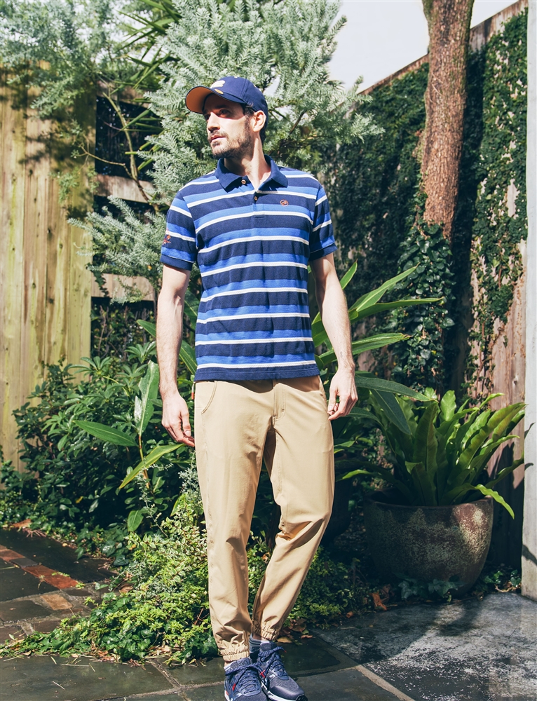 「太陽と遊ぶ」というコンセプトを持ったシェルテックパンツをメインにしたコーデ。吸水速乾やUVケアといった素材の機能に加え、使いやすいポケットやグローブホルダーなど、デザインでも機能性を考慮。トップスはサーフテイストでカジュアルなポロシャツを合わせることで、ゴルフはもちろん、アウトドアなど真夏のアクティビティでの着用も意識したコーディネイトに。