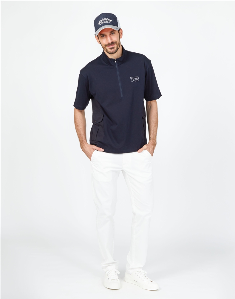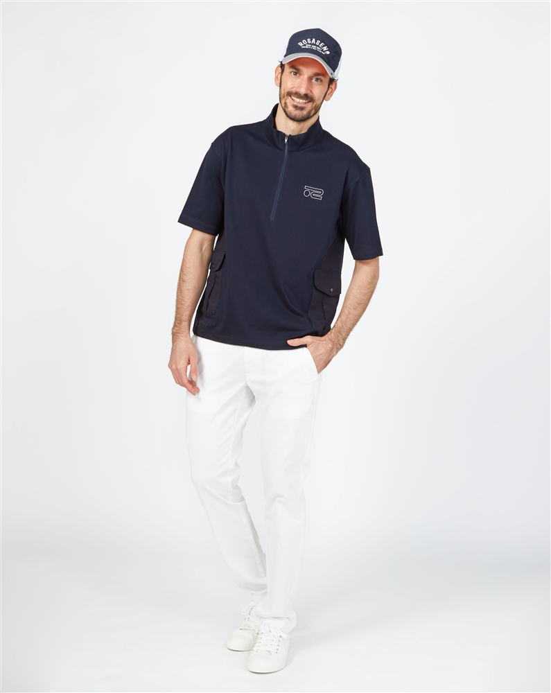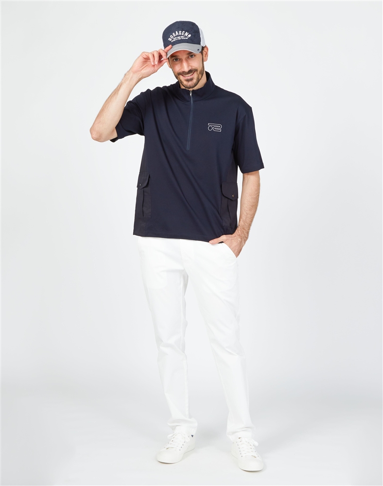 スタンドカラーのハーフジップシャツにシンプルなチノパンツを合わせたスタイリング。シャツは少しゆとりを持たせたトレンド感のあるシルエット。異素材のポケット使いや背面をメッシュ素材で切り替えるなど、他にはないデザイン。