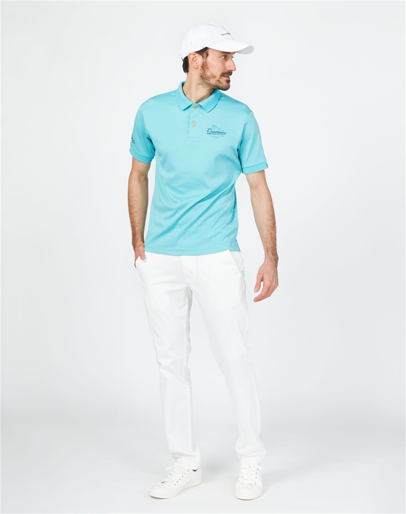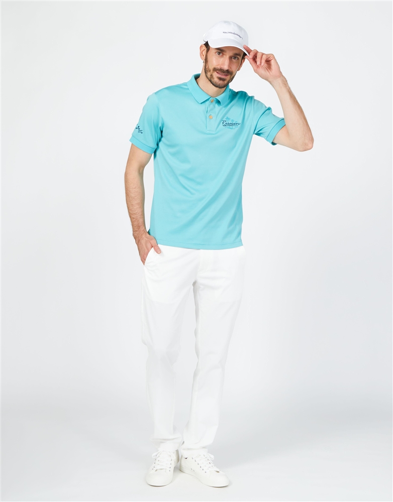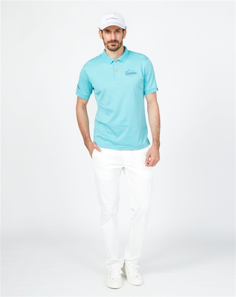 ポロシャツにチノパンを合わせた定番コーデ。シャツはエメラルドグリーンをチョイスすることで上品な印象に。パンツ、キャップをホワイトで合わせたきれい目なスタイル。