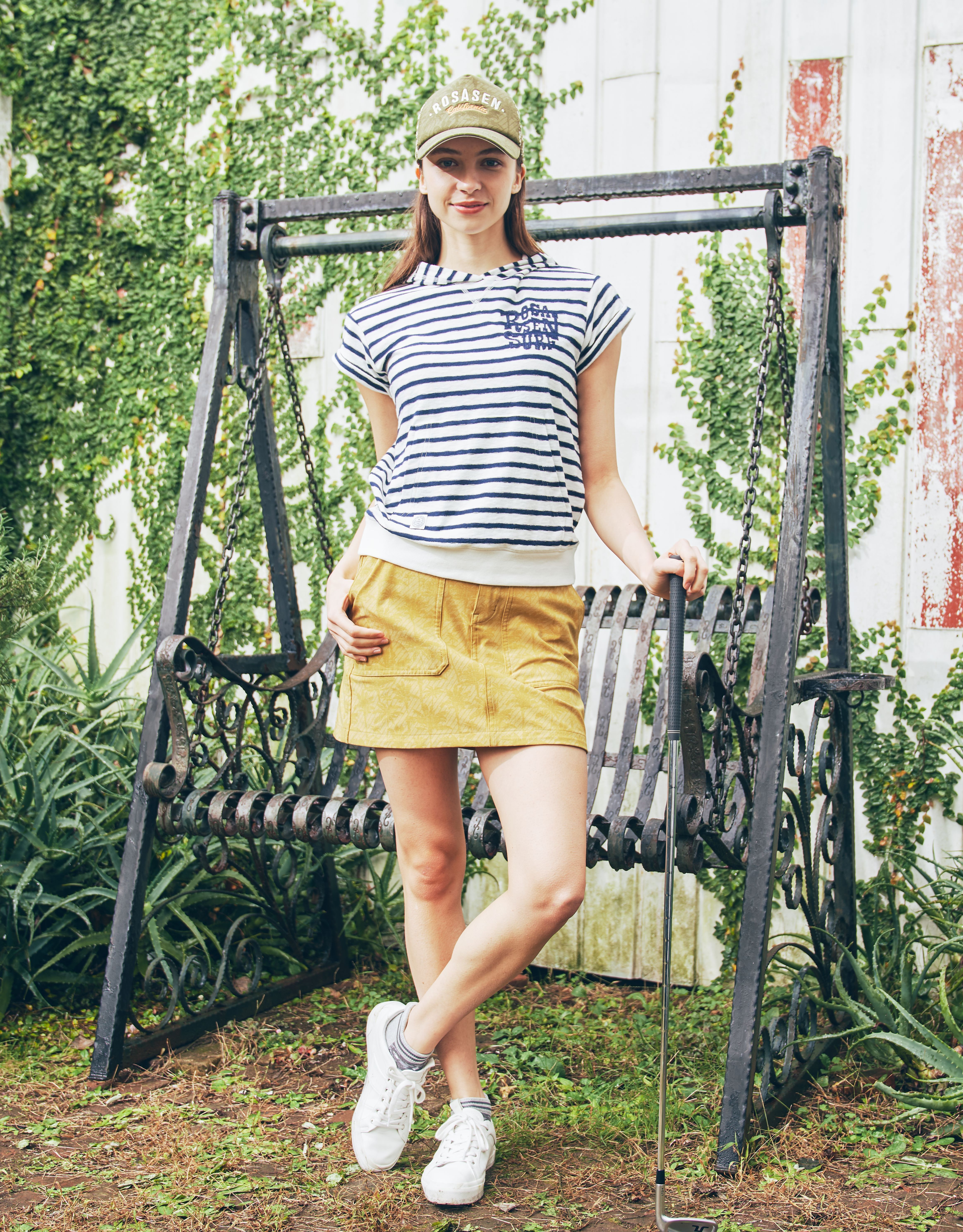 リゾート感のあるゆったりとしたシルエットの半袖パーカーにリバーシブルスカートを合わせたスタリング。スカートにさりげなくプリントされたヴィンテージヤシ柄が大人っぽく上品な印象。キャップも同柄で合わせることでまとまり感のあるコーデに。