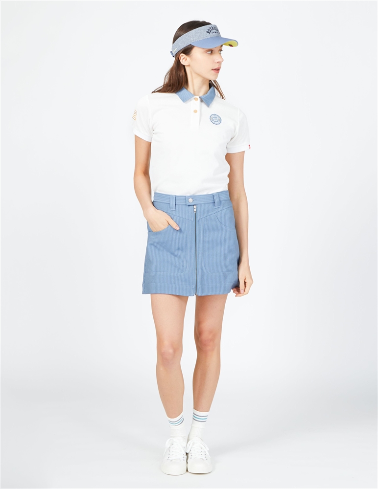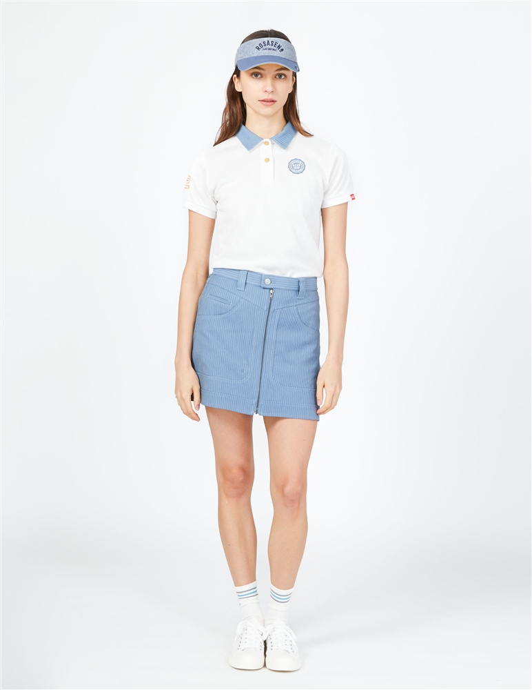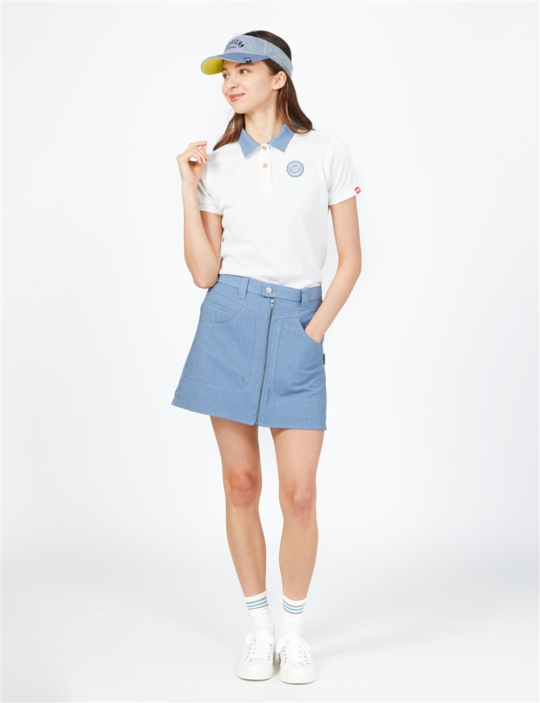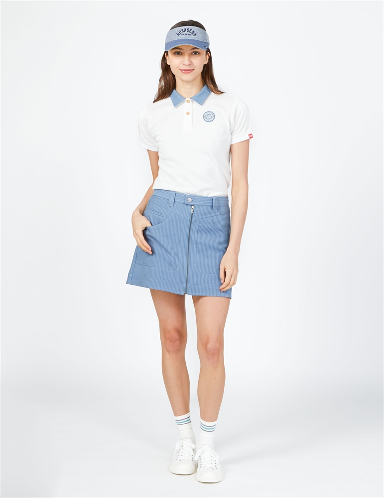 スカートとポロシャツの衿をヒッコリー素材で合わせたセットアップスタイル。ヒッコリー素材はカジュアルな見た目とは裏腹にストレッチ性に優れ、撥水機能も備えた高機能素材。合わせたポロシャツも通気性に優れ、吸水速乾機能付き。ロサーセンらしいカジュアルなセットアップスタイルながら、ゴルフに必要な機能性もしっかりと備えたコーディネイト。