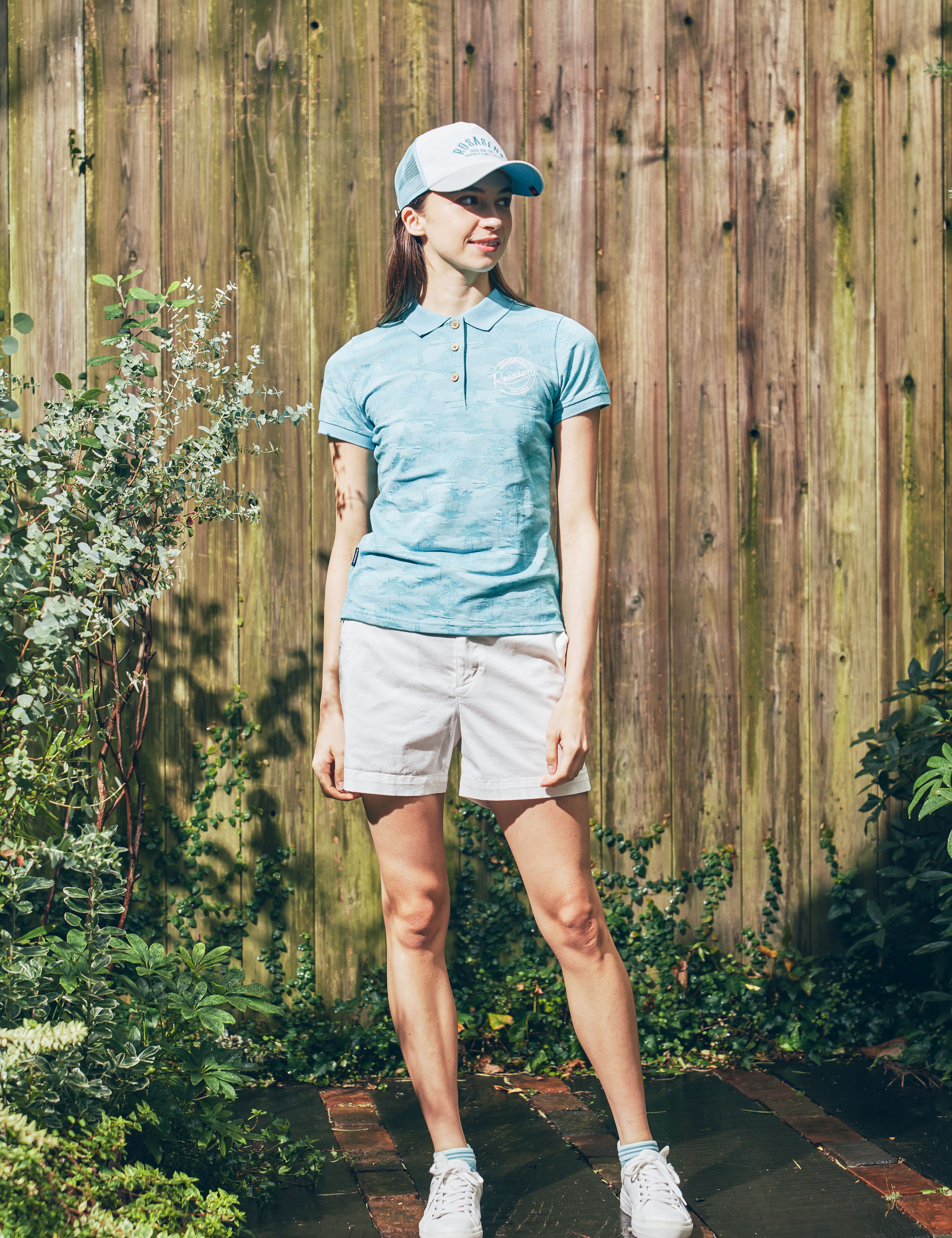 爽やかなエメラルドグリーンのポロシャツに白のショーツを合わせたコーディネイト。ポロシャツにさりげなく入ったアロハ柄も上品で大人っぽさもプラスしたスタイリング。