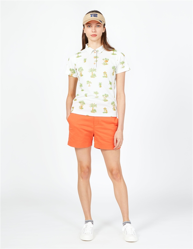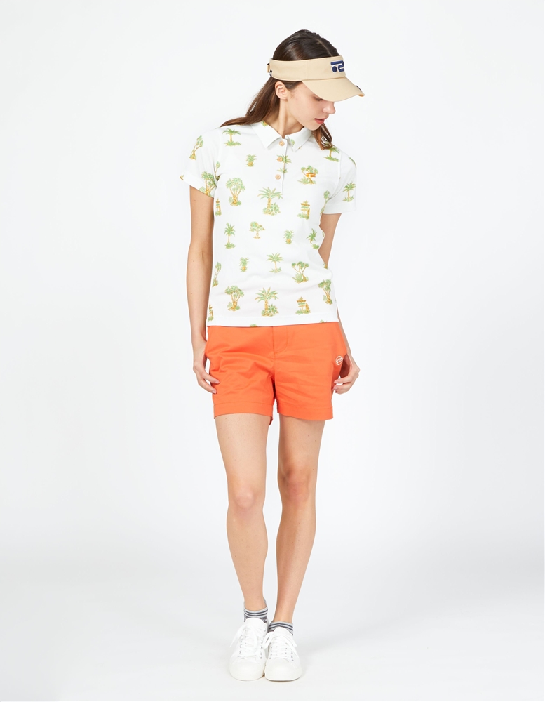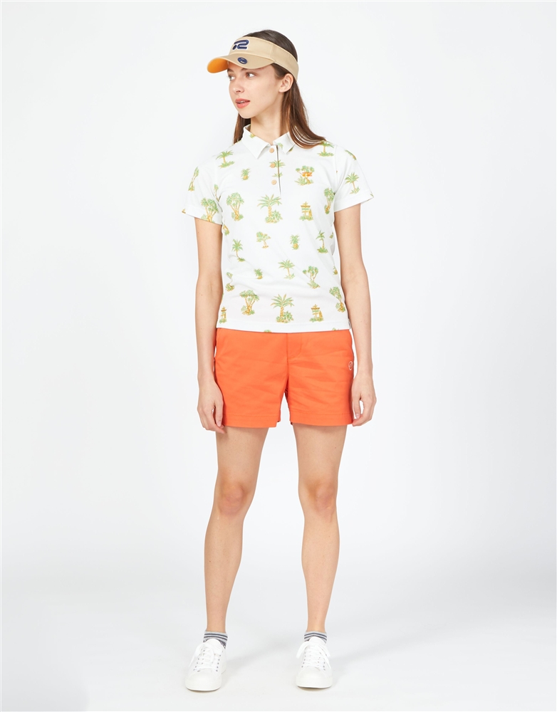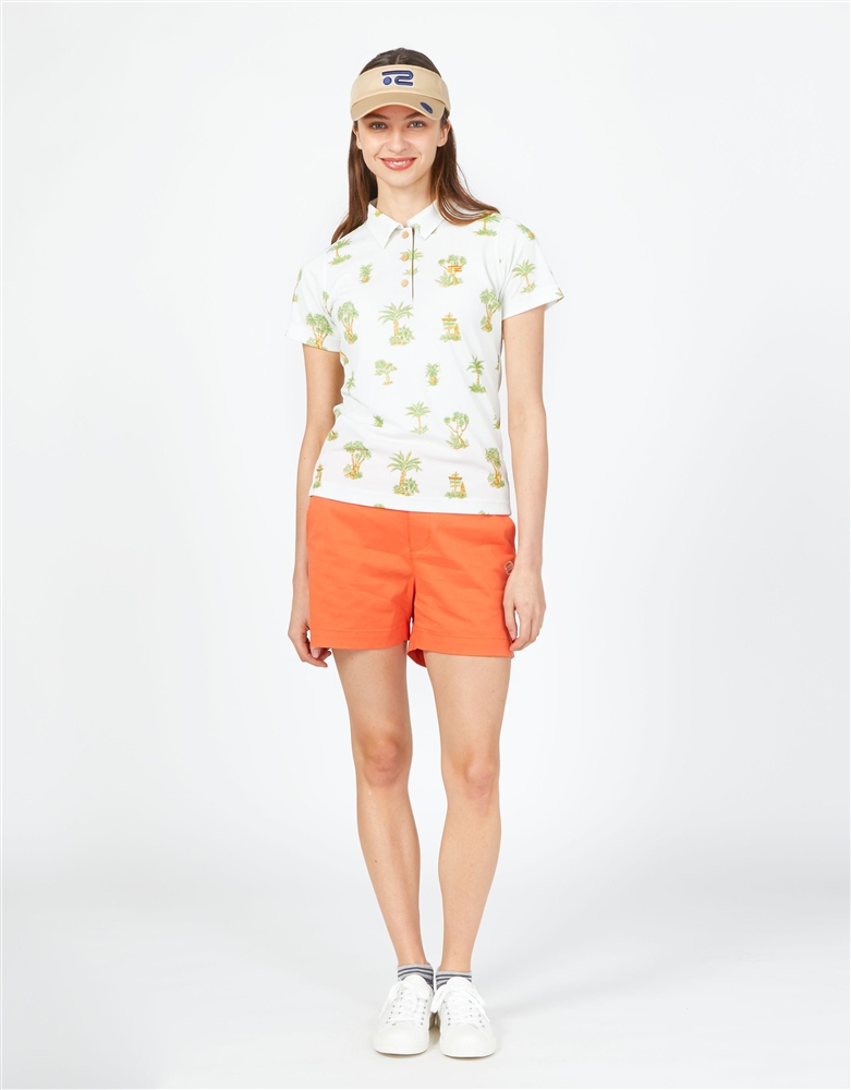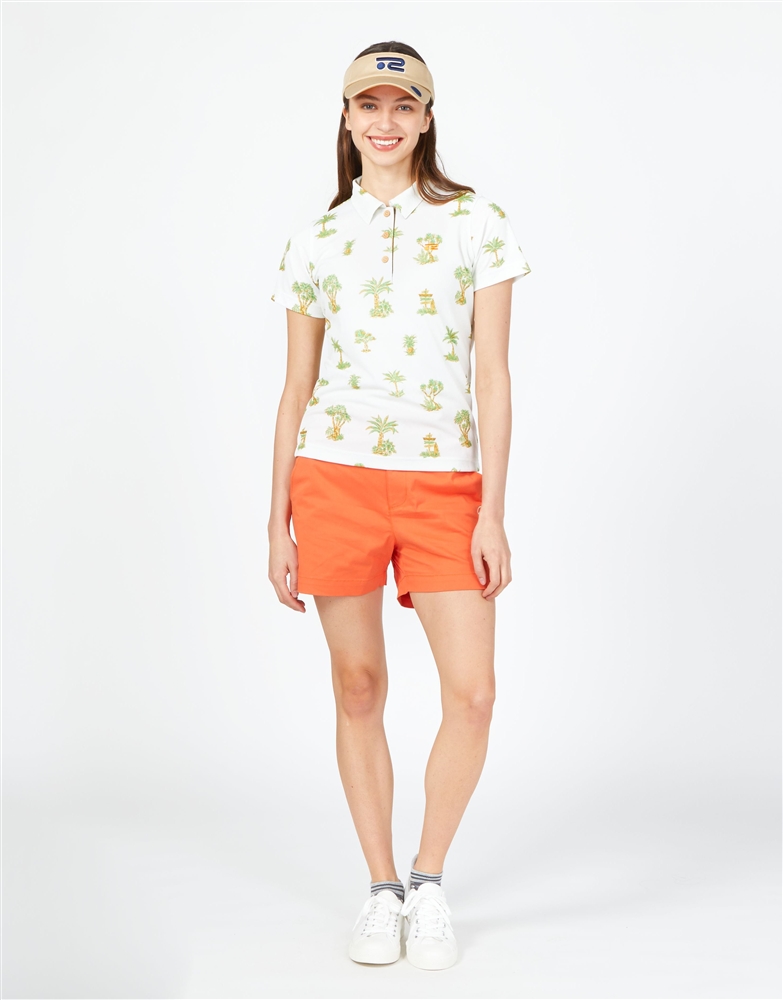 ヴィンテージ調のヤシ柄シャツをメインにコーディネイト。カジュアルなデザインだが、機能性にも優れたアイテム。ボトムは鮮やかなオレンジのショーツを合わせることで、夏を感じさせるリゾートスタイルに。