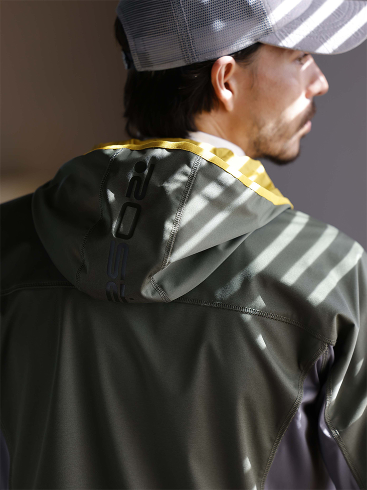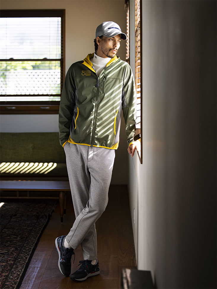 配色がポイントのブルゾンにロサーセンロゴのキルトパンツと同素材のキャップを合わせたスタイリング。ブルゾンは3層構造の透湿・防風・撥水機能を持つ。暖かいキルトジャカードのパンツ、同素材のキャップとインナーに起毛素材を着用する事によって、寒い時期にも快適にプレイできるコーディネイトに。