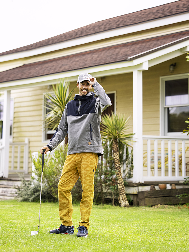 コーデュロイのアノラックパーカーをメインに落ち着いた色味のパンツを合わせたスタイリング。オリジナルで作成したコーデュロイは保温性とストレッチ性に優れた素材感。さらに防風裏地を使用しているため、カジュアルなスタイリングながら、機能性に優れた冬のラウントに最適なコーデ。