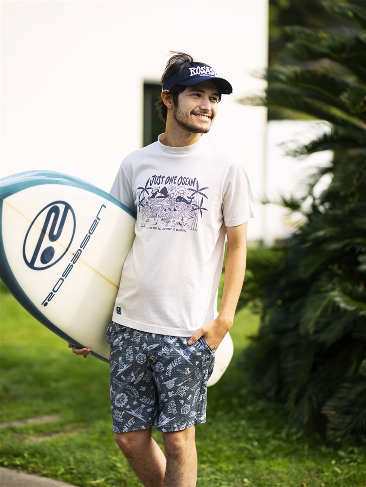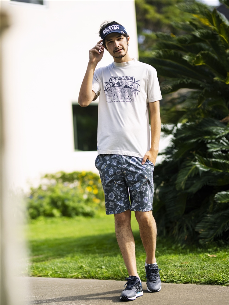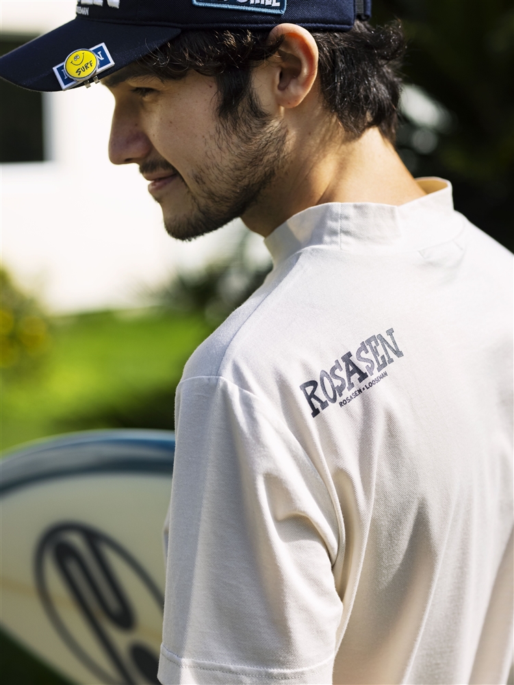 環境に対してのメッセージとエコ素材を組み合わせた夏の打ち出しのルーズマンコラボシリーズ。モックネックには海中で溶解する生分解性のポリエステル糸を使用した吸水速乾機能のエコ素材で、『 JUST ONE OCEAN』のメッセージ入りプリントがポイント。パンツにはシアサッカーにルーズマン総柄プリントをしたエコ素材のクールマックスエコメイドを使用。ベージュとチャコールで大人な色合いが特徴のキャディや小物まで統一したコーディネイト。