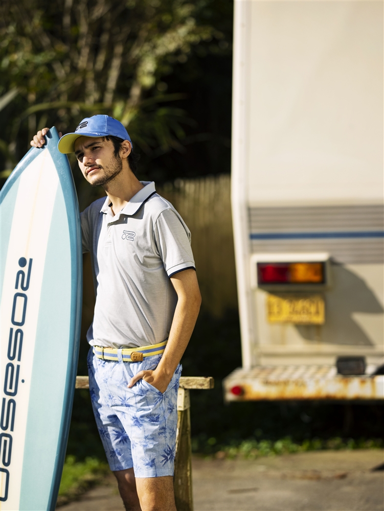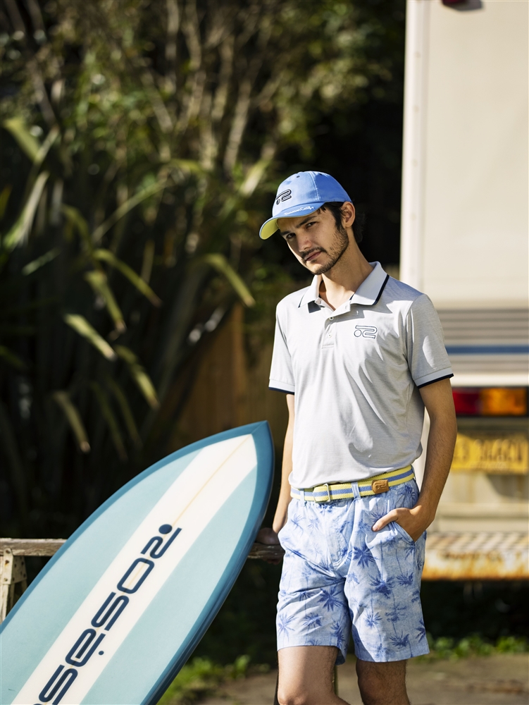 夏のクール系アイテムのベストバイスタイル。上下ともにメッシュ素材を使っており、シャツには気化熱冷却のクーリング効果があるので、汗が流れる夏にも涼しさを感じさせる。パンツは夏らしいプリントをした吸水性のあるドットエアーを使いファッション性と快適性を両立させたコーディネイト。