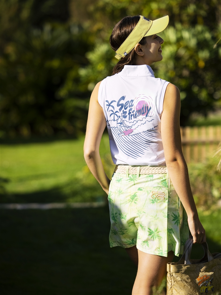 環境に対してのメッセージとエコ素材を組み合わせた夏の打ち出しのルーズマンコラボシリーズのノースリーブシャツと、涼しげなヤシの木の総柄スカートのセットアップ。シャツは吸水速乾とUV機能を併せ持つクールマックスのエコ素材で『 Sea Friendly 』のメッセージ入りバックプリントがポイント。インパンツ付のスカートは軽量で高通気機能を持つ、どちらも夏に最適なアイテム。ライムカラーのバイザーが爽やかな、女性らしいスポーティーなコーディネート。