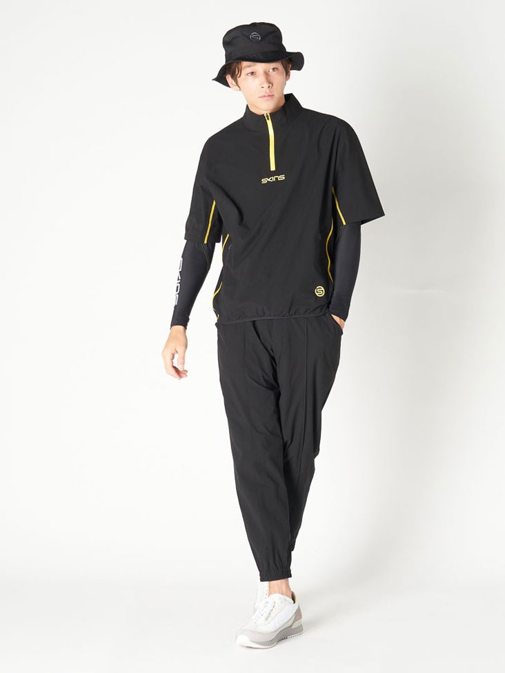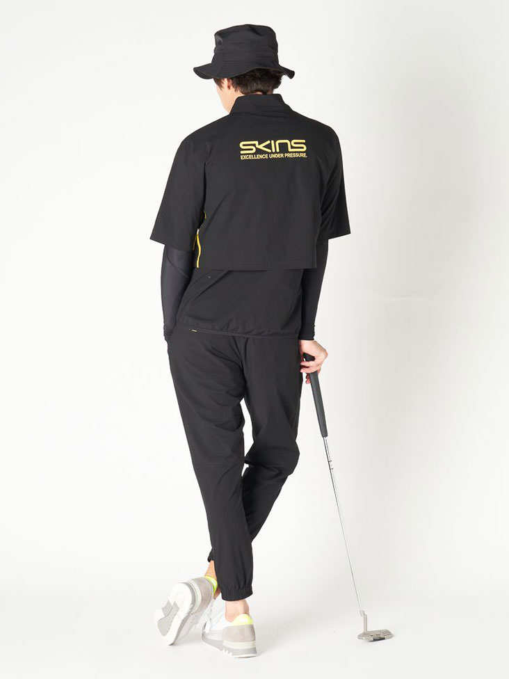 コンプレッション+半袖スニードジャックでインナー要らず快適プレイスタイル。 TOPSはコンプレッションのトップスや、Tシャツと組み合わせで、そのままゴルフプレイを可能にする軽量半袖スニードジャックです。インパクトある配色ステッチやモチーフ、表情のある止水ファスナージップアップが高級感を醸し出しています。インパクトと実用性を兼ね備えた価値ある逸品です。ボトムは撥水、ストレッチ機能が付いた裾リブ付きジョガーパンツ。ポケットの内側の生地にメッシュ素材を使用し通気性にも配慮しています。前部分にはピンタックでクリーズ線をだす事でキレイ目な着こなしを目指しています。左後ポケットには配色閂止めやモチーフ配色で、他のウエアと組み合わせしやすいデザインになっています。