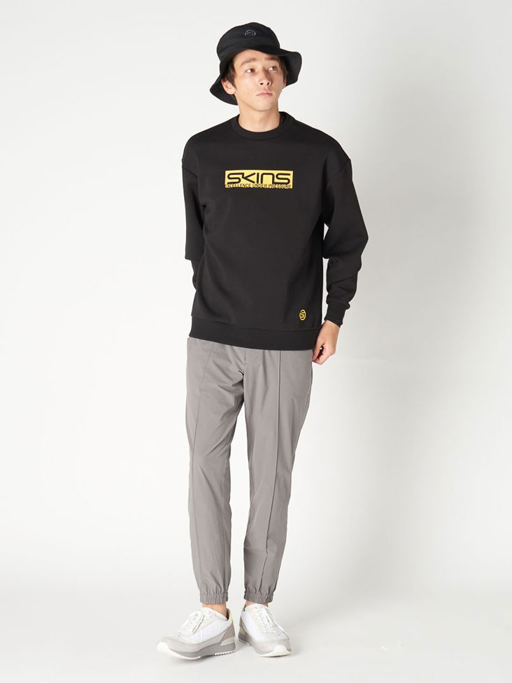 ダンボールトレーナーとパンツのリラックススタイル。 TOPSは肌触りの良い適度なふくらみ感が特徴なダンボールニット素材でシンプルに着こなせるクルーネックトレーナーです。シルエットもドロップショルダー、オーバーサイズなのでトレンド感も加味されています。正面のSKINSロゴモチーフはBOXロゴで表現しており、SKINSファンを引き付けるインパクトのある表現となっています。ゴルフシーンに限らず、着用いただけます。ボトムは撥水、ストレッチ機能が付いた裾リブ付きジョガーパンツ。ポケットの内側の生地にメッシュ素材を使用し通気性にも配慮しています。前部分にはピンタックでクリーズ線をだす事でキレイ目な着こなしを目指しています。左後ポケットには配色閂止めやモチーフ配色で、他のウエアと組み合わせしやすいデザインになっています。
