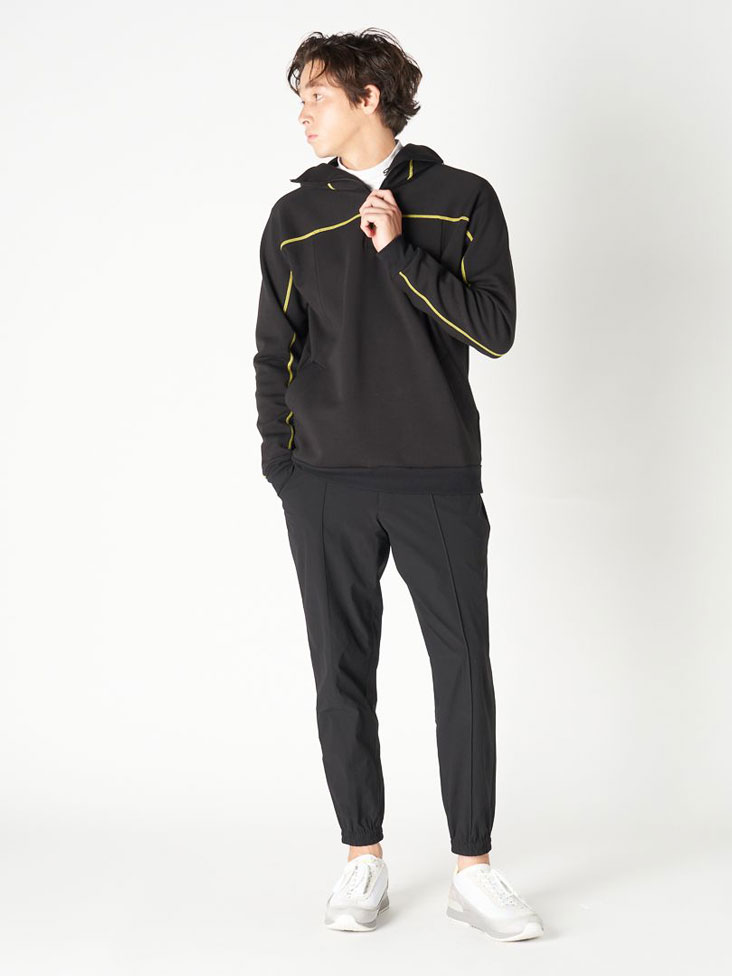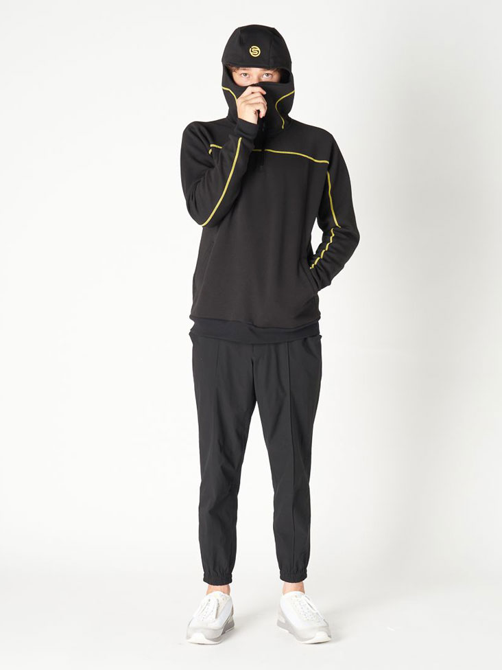 ダンボールパーカー+防風パンツでのストロングスタイル TOPSは肌触りの良い適度なふくらみ感が特徴なダンボールニット素材で、今回のテーマである黒の騎士団をイメージさせるフーディーミドラーです。フード前明き部分も高めに設定されており、まるで西洋甲冑の様な着こなしが可能です。インパクトある配色ステッチとモチーフは甲冑に使われる装飾を表現しています。機能性と強さを表現ています。ボトムは撥水、ストレッチ機能が付いた裾リブ付きジョガーパンツ。ポケットの内側の生地にメッシュ素材を使用し通気性にも配慮しています。前部分にはピンタックでクリーズ線をだす事でキレイ目な着こなしを目指しています。左後ポケットには配色閂止めやモチーフ配色で、他のウエアと組み合わせしやすいデザインになっています。