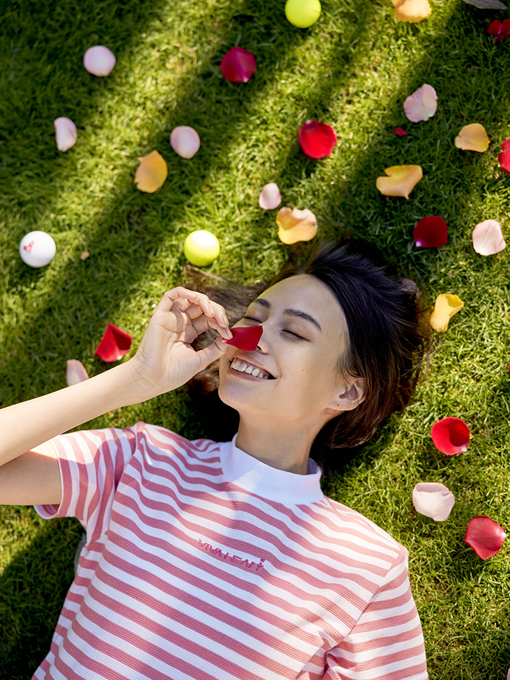 肌さわりの良いワッフル素材の鮮やかな色のボーダーモックネックとスカートは軽くて伸縮性のある素材のを使ったラインパイピングと裾部分は切り替えのソフトフレアなスポーティーなスカートのスタイリングです。小物をネオンイエローやブラックを使うことで甘すぎないクリーンでさわやかでありながら女性らしい印象のスタイリングです 初心者の方はもちろん上級者の方も満足いただける商品を使ったスタイリングです。