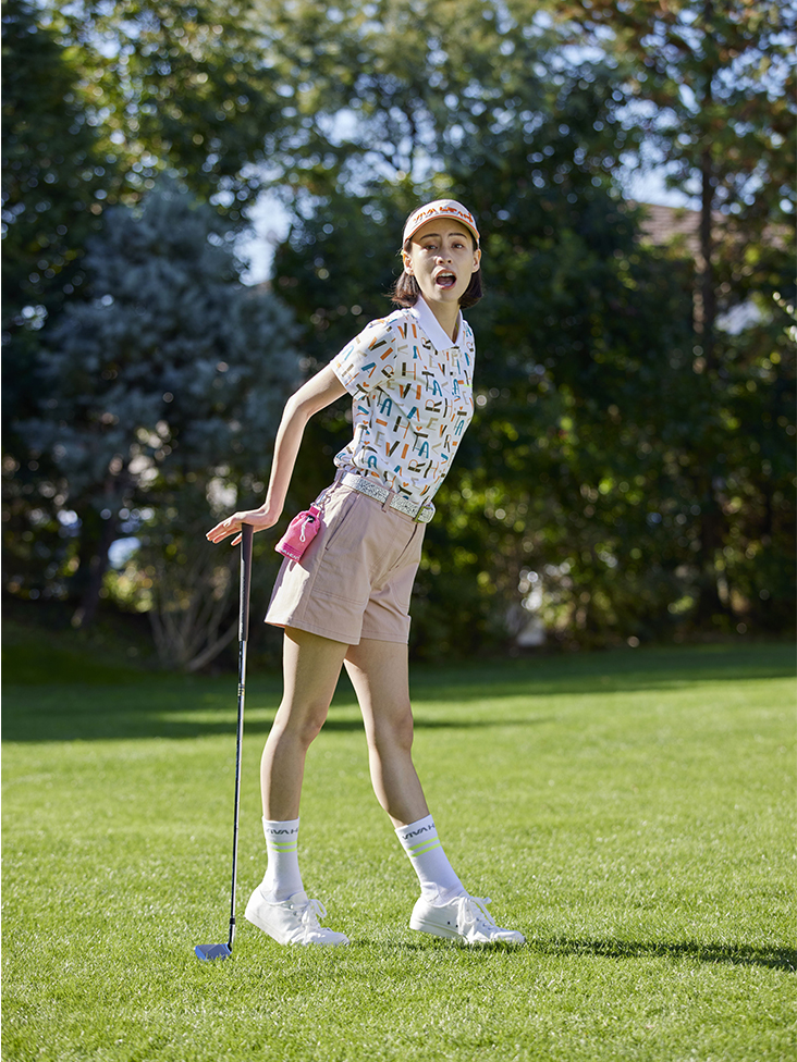 色鮮やかで丸みを帯びたフォントがポップな印象のポロが目を引くスタイリングです。あえてボトムは少し裾が広く台形シルエットのキュロットタイプのチノっぽい見え方の綿ライクな撥水ポリエステルを使用のショーツでカジュアルなイメージに見せ 上半身はより華奢に見えスタイルが良く見えるAラインのバランスなスタイリングにしています。