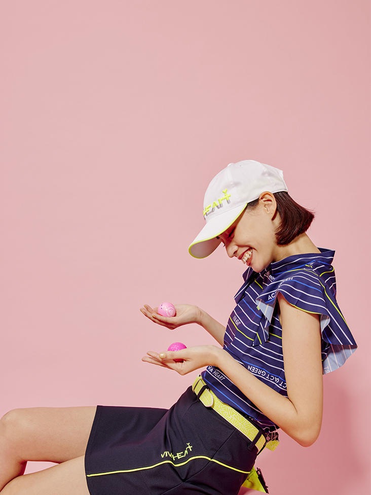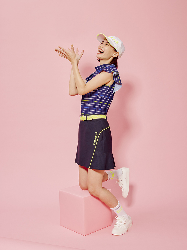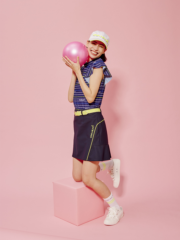 袖のフレアーがポイントの涼し気な同系色のタイポPTの入ったボーダートップスは 「コンチェロ」素材を使用したとっても軽くて涼しい素材を使ったアイテムです。スカートは軽くて伸縮性のある素材のを使ったラインパイピングと裾部分は切り替えのソフトフレアなスポーティーなスカートとのスタイリングです どちらも女性らしいディールのアイテムですが使ってる素材は本格的な素材なので プレーのパフォーマンスは邪魔しない本格的なアイテムです。
