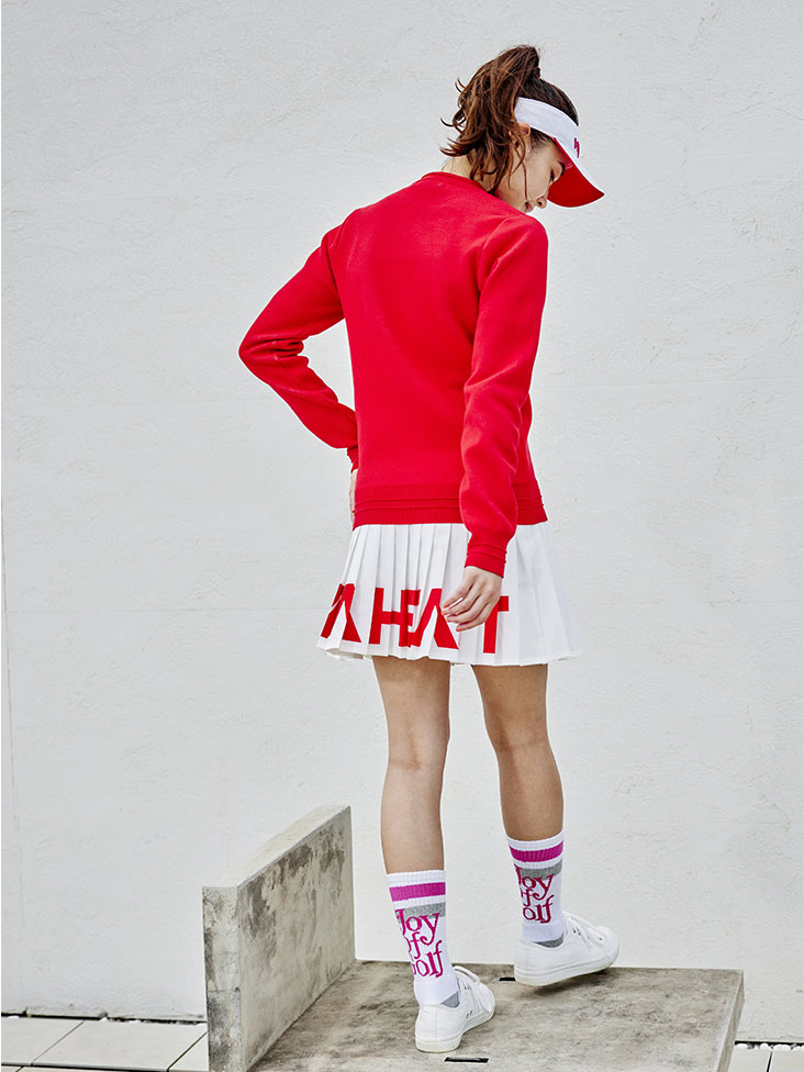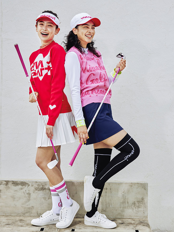 スポーティーなブランドロゴを生かしつつ、ファンの多いVIVA HEARTのハートマークを大きく使ったグラフィックがかわいいニットと、腰回りがすっきり見えるデザインカットのプリーツスカートは後ろの裾には大きなロゴが揺れる完璧映えスタイリングです。洋服が少し甘目なのでソックスはカジュアルなミディアム丈を合わせて今っぽくまとめるのが今シーズンのVIVAHEARTのスタイリングイメージです。