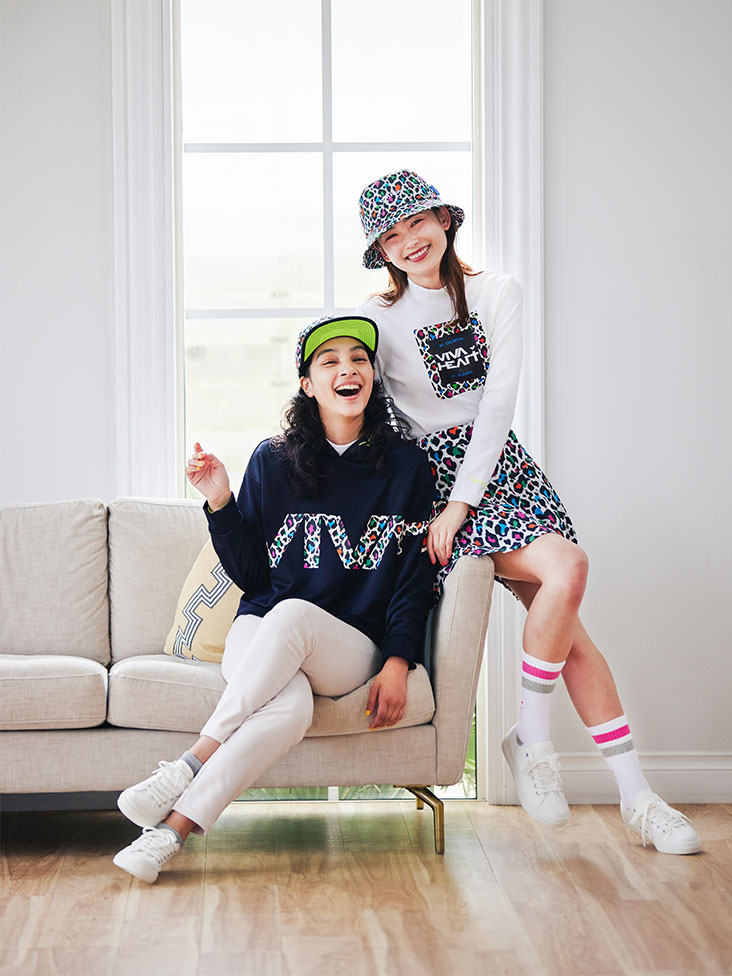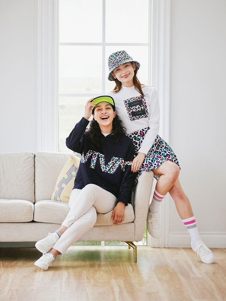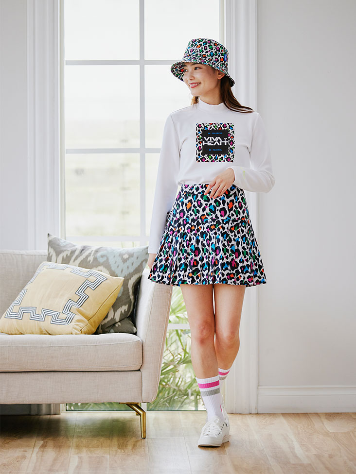 ポップでアーティーな「PARTYLEOPARD」柄がアイキャッチになる注目のグラフィック。着ててテンションの上がるプリーツスカートと中肉で軽量なダンボール素材のモックネック、バケットハットのスタイリングです。