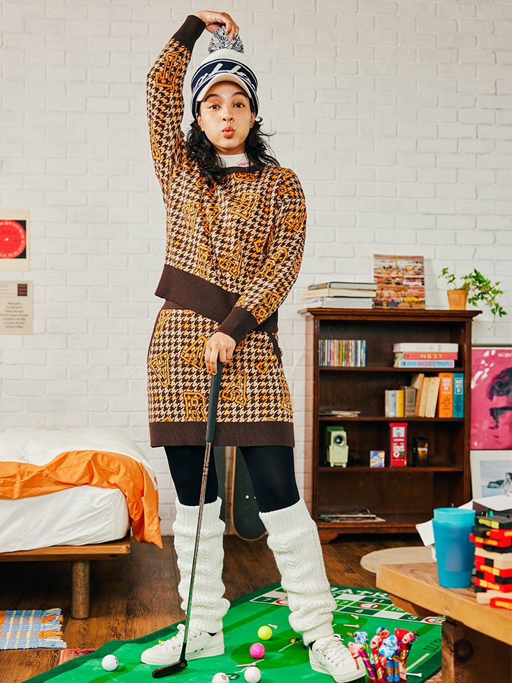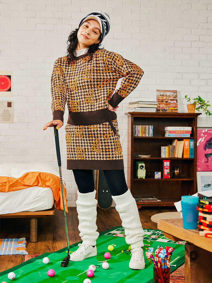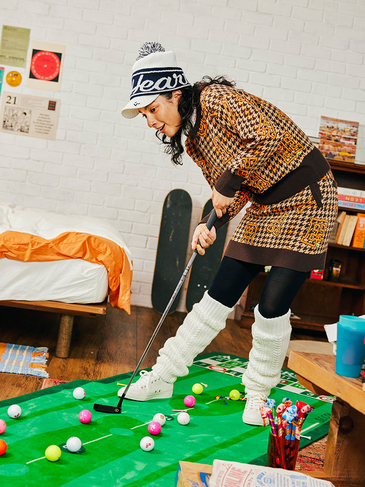 オーセンティックな千鳥柄とカレッジアルファベットの相反する見え感がとってもキャッチーなニットスカートとセットアップのスタイリング。