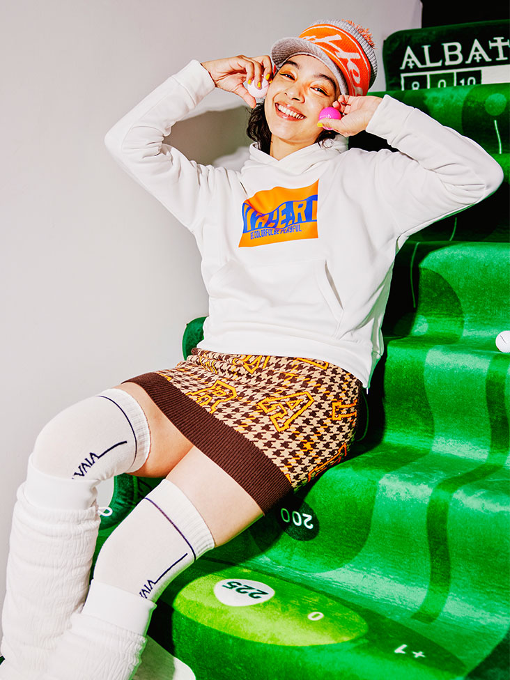 裏起毛の生地に厚みのあるふっくらしたフーディーTOPSにチェックのニットジャガードのスカートを合わせた練習にも行けるカジュアルなスタイリング。