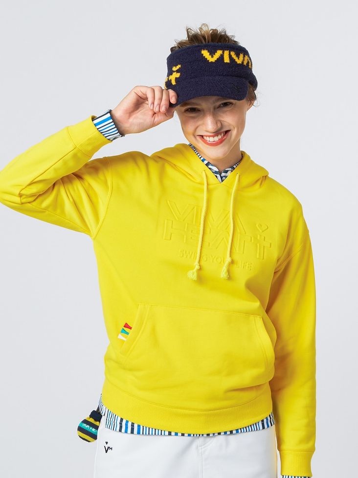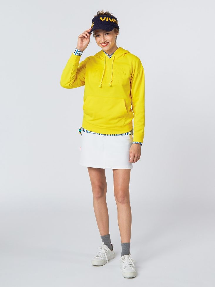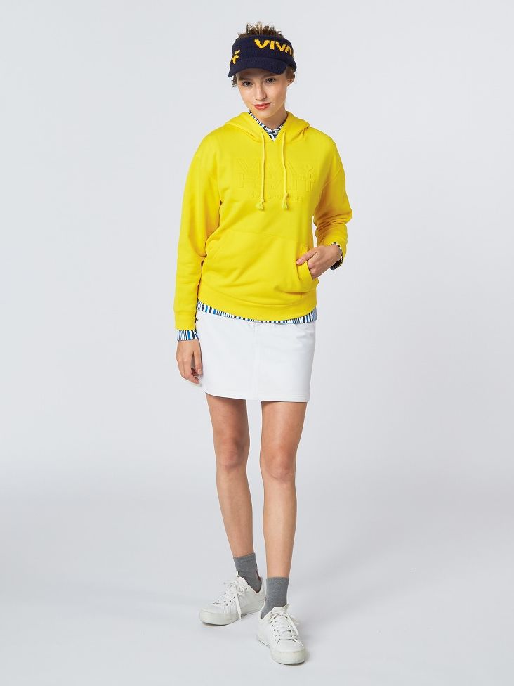 オリジナルポリエステルヤーン「TEXBRID」を使用したフーディーはバネ状の分子構造糸により優れたストレッチ性とキックバック性、又高耐久性にも優れた裏毛素材です。生地の裏面からエンボス加工をかけて3Dに浮き上がったブランドロゴがクリーンでシャープな印象のアイテムです。はっきりとしたイエローカラーをホワイトとアクセントになるブルーを差し色に入れた明るく清潔感のあるスタイリングに仕上げています。