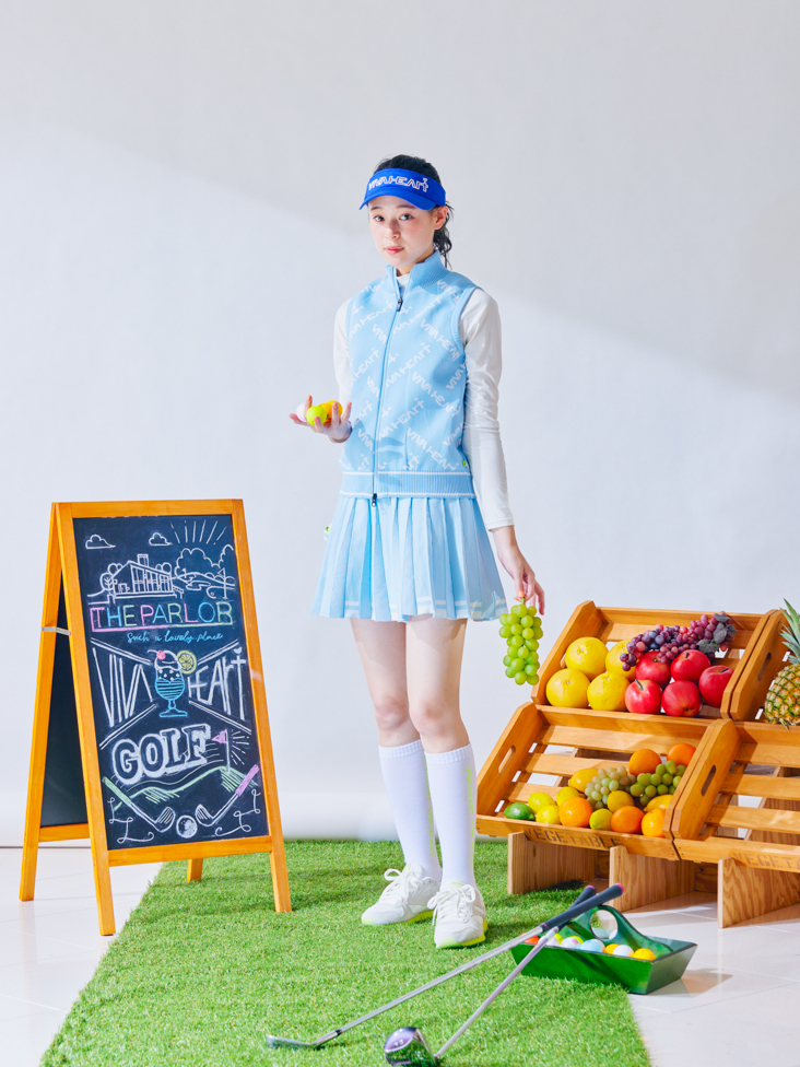 プリーツスカートのメッシュが、軽やかな春を感じさせてくれます。ニットベストはフロント部分が開くので体温調節もしやすく、撥水機能がある糸でできているため、雨が心配な季節でもゴルフを楽しめるアイテムです。