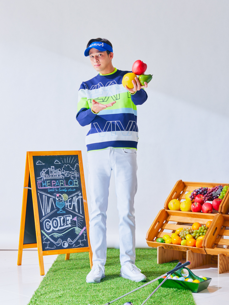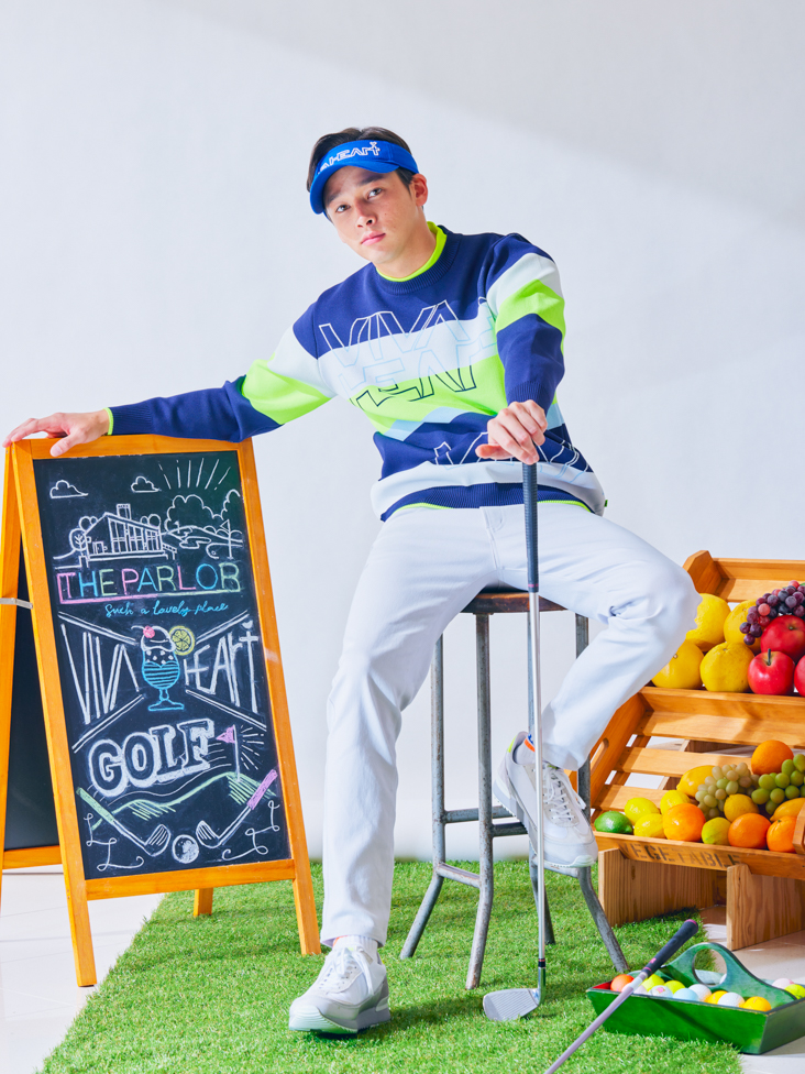 春シーズン一押しアイテムの、VIVA HEARTのロゴとカラーボーダーがランダムに並べられたジャガードニットは、ポリエステル糸を使用し軽いのが特徴。トップスが鮮やかなカラーなので、ボトムスはクリーンなライトグレーとスリムシルエットで強弱をつけているのがポイント。メンズらしい清潔感のあるスタイリングが完成します。春シーズンのゴルフラウンドでもとても目を惹くスタイリングです。