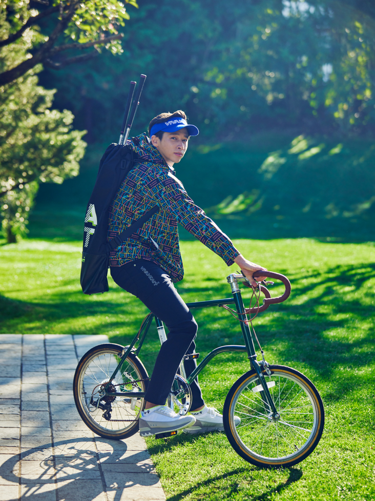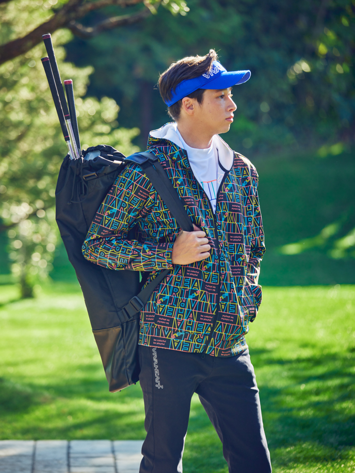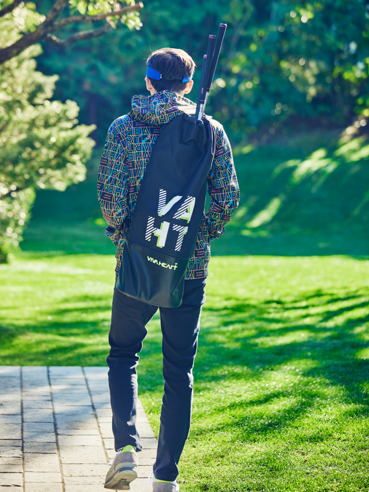 中肉で滑らかな肌触りのダンボール素材を使用したフーディーは、寒暖差の激しい季節のプレイ時にも重宝するアイテム。フード部分はだれない様に小さめで、後ろに流れすぎず、キレイに収まる設計にしています。ブラックを基調にしているので、ボトムスもスリムシルエットのブラックチノで合わせると相性が抜群です。バイザーはトップスで使用しているカラーの1つ、ブルーにすることで全体がすっきりとした印象になります。