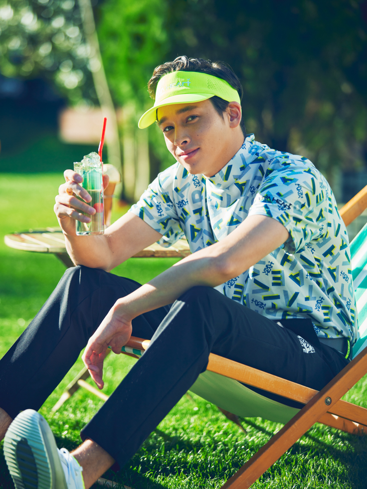 重なりあった色とラインで作られたランダムグラフィックで表現されたモックネックシャツは、動きに合わせメッシュ構造が風を身体に取り入れます。汗をかきやすいこの時期のラウンドには最適な素材。ボトムスは「DOT AIR」を使用し、軽量、撥水ストレッチを持たせた超ハイブリッド素材を使用したこの時期に最強なアイテム。