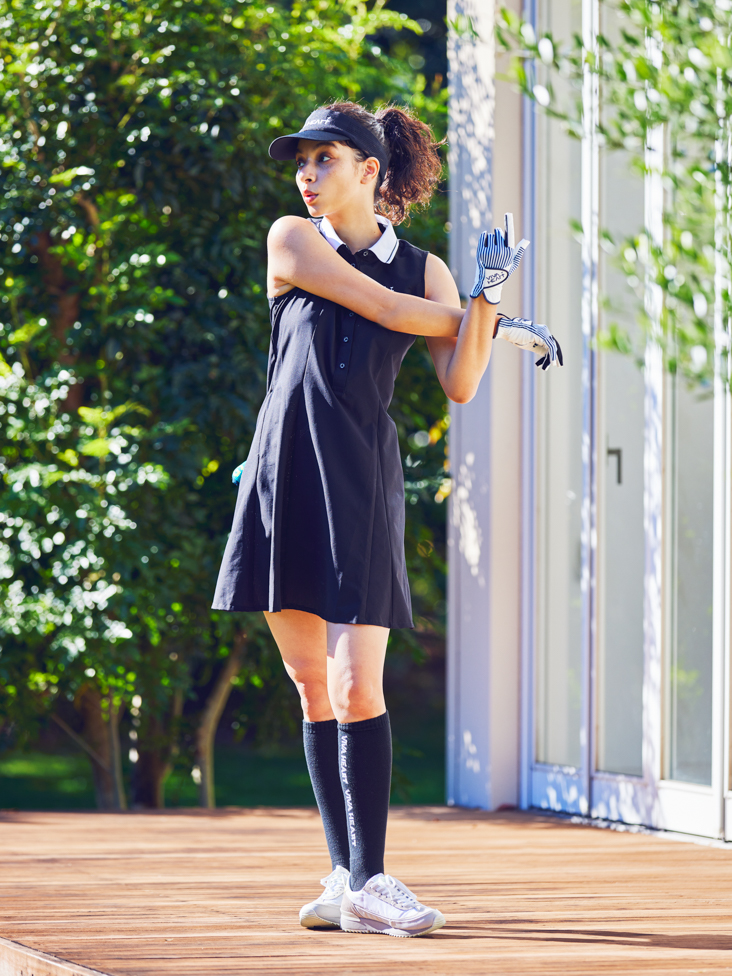 フェミニンなデザインのシャツワンピースは、着用シルエットをよくするために形にこだわったアイテム。「DOT AIR」素材を使い、衿はホワイトのポロ衿でスポーティーだけどクラシカルなフェミニンなイメージに。ソックスやバイザーを同じくブラックでスタイリングして、真夏のグリーン映えるで大人っぽいモノトーンでクールに見せるスタリングです。