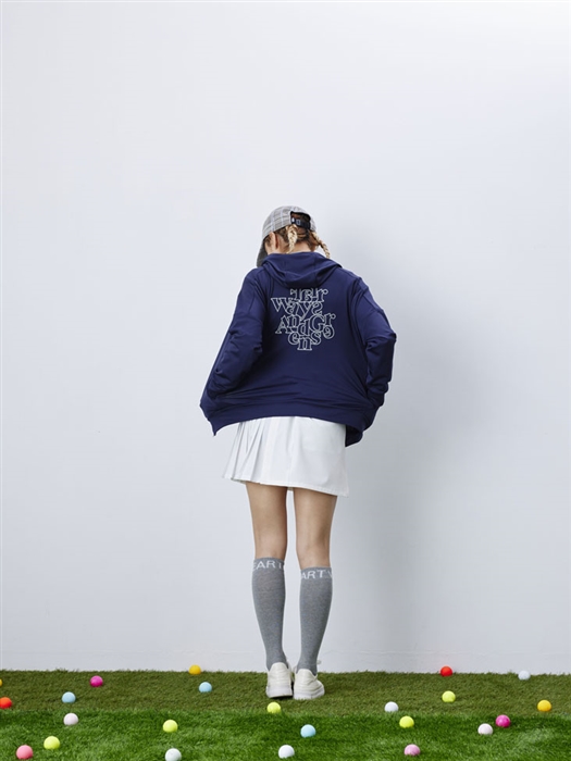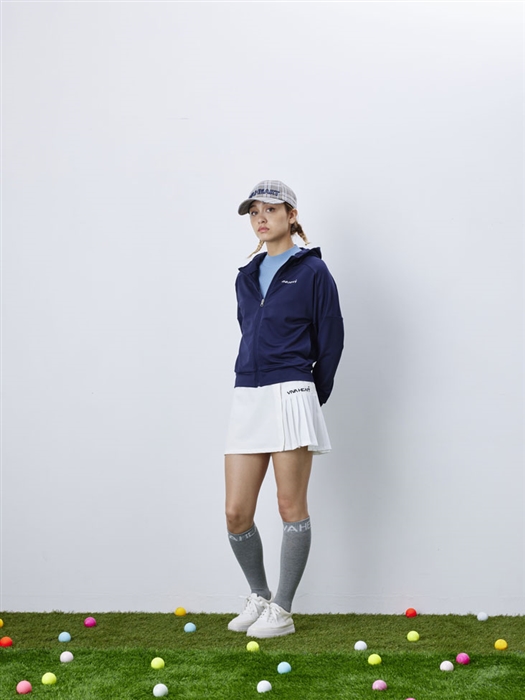 女性らしいプリーツデザインのスカートと大人っぽいリブニットのスタイリングに、ストレッチ性に優れたジャジー素材のジップパーカーを合わせ、フェミン過ぎないこなれたスタイリングに仕上げました。