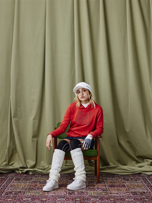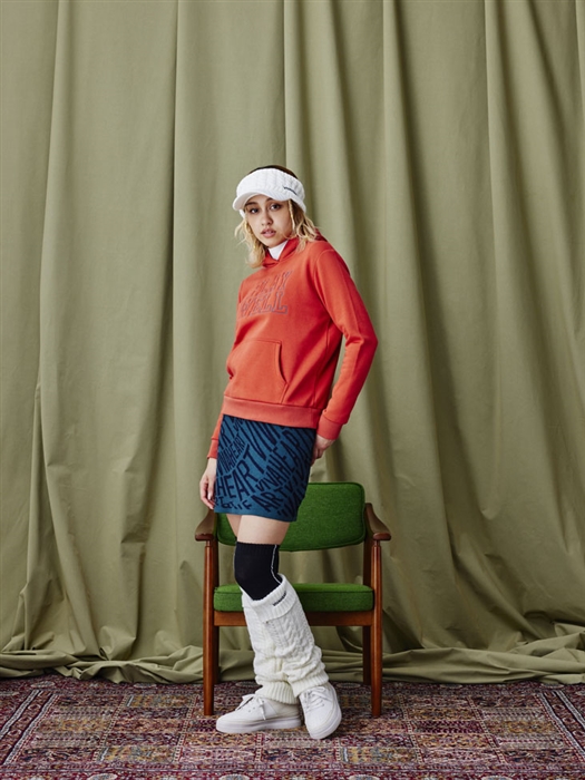 裏起毛が気持ち良いオレンジ色のフーディープルオーバーに、毛玉ができにくい糸で編んだニットジャガードのターコイズニットを合わせたスタイリングです。配色合わせはむつかし感じがしますが、色のトーンを合わせるとで相性良く着こなすことができます。秋らしいこっくりたカラーで、紅葉美しいラウンドとの相性はピッタリなスタイリングです。