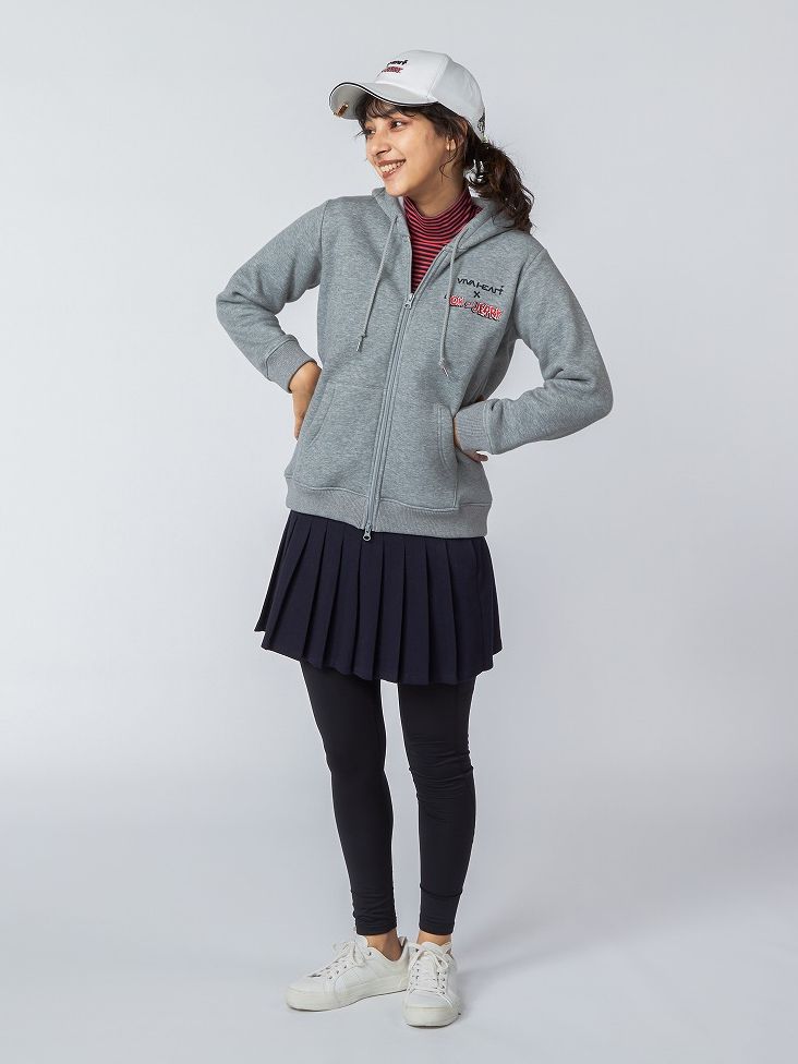 軽くて温かい裏起毛素材を使用したフルジップパーカー。後ろ身には仲良くカートに乗ったトムとジェリーのオリジナルプリントでカートゥーンアニメの楽しさが溢れているのがポイントです。可愛らしくガーリーにコーディネイトするのに欠かせないプリーツスカートでハッピーな見え感にしています。