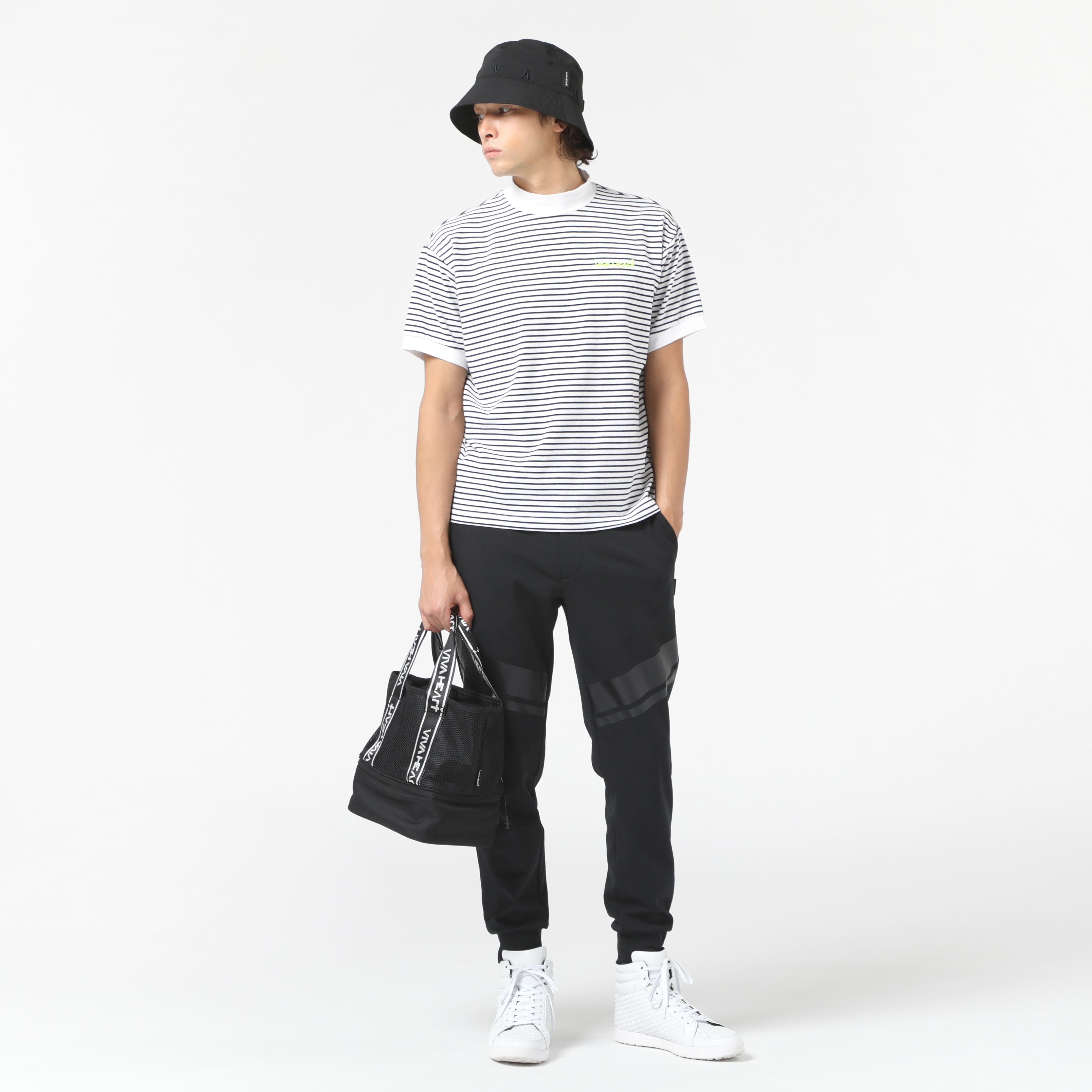 細めのボーダーカットを主役としたコーディネート。衿と袖口を無地にする事で生まれるカジュアル感を大切にしています。絶妙なサイジングと衿の高さ、しなやかな素材感でゴルフのみならず、普段使いのユーティリティの高さが自慢のモックネックです。