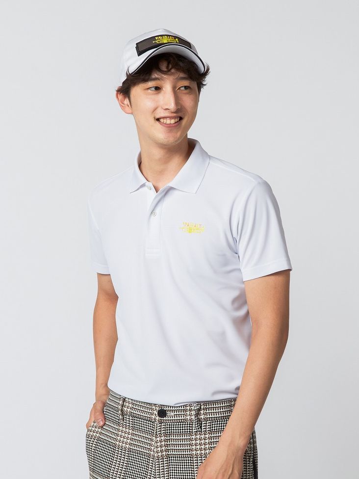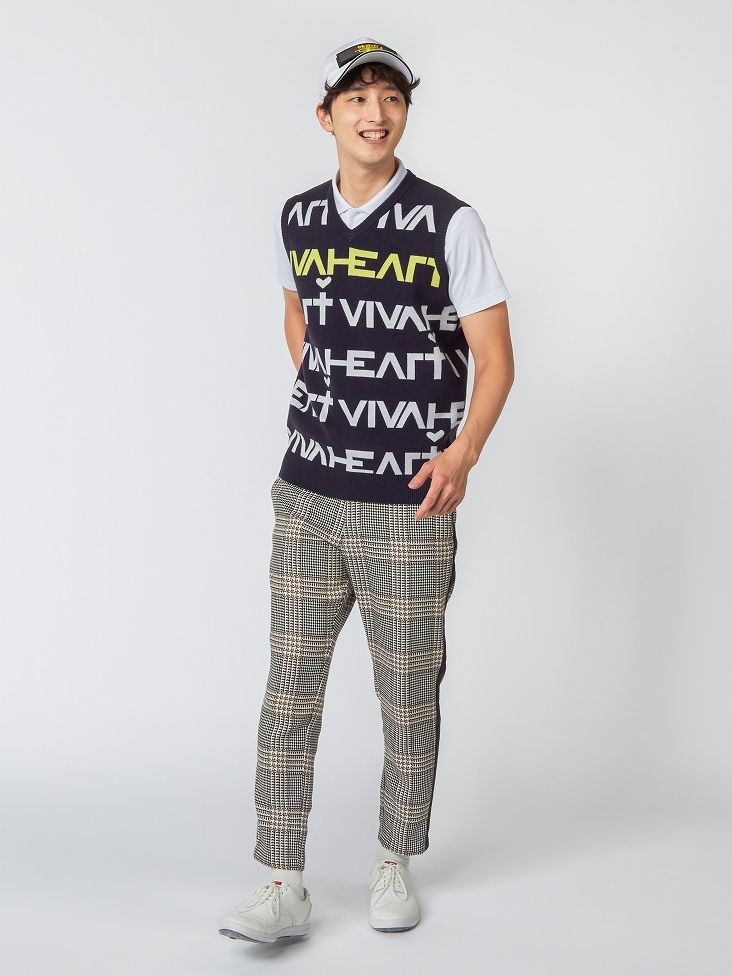 大胆な総柄ジャガードロゴをがインパクト大のベストアイテム。オーセンティックなサイドラインのチェックパンツとロゴアイテムの相反するMIXスタイリングが新鮮。グリーン上でもオリジナリティとアイキャッチになる事間違いなしの「LOGOMANIA」になれる差別化スタイリングです。