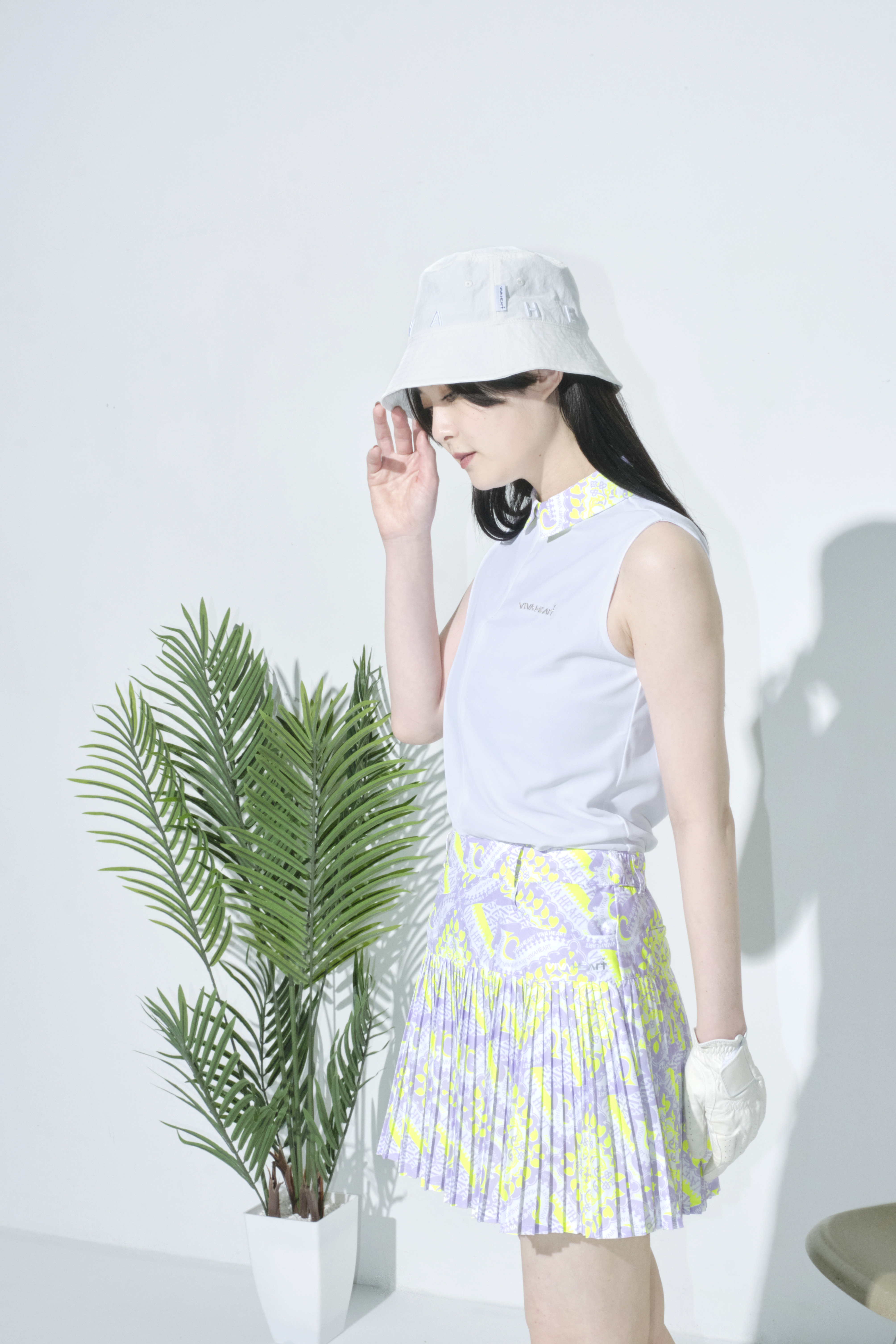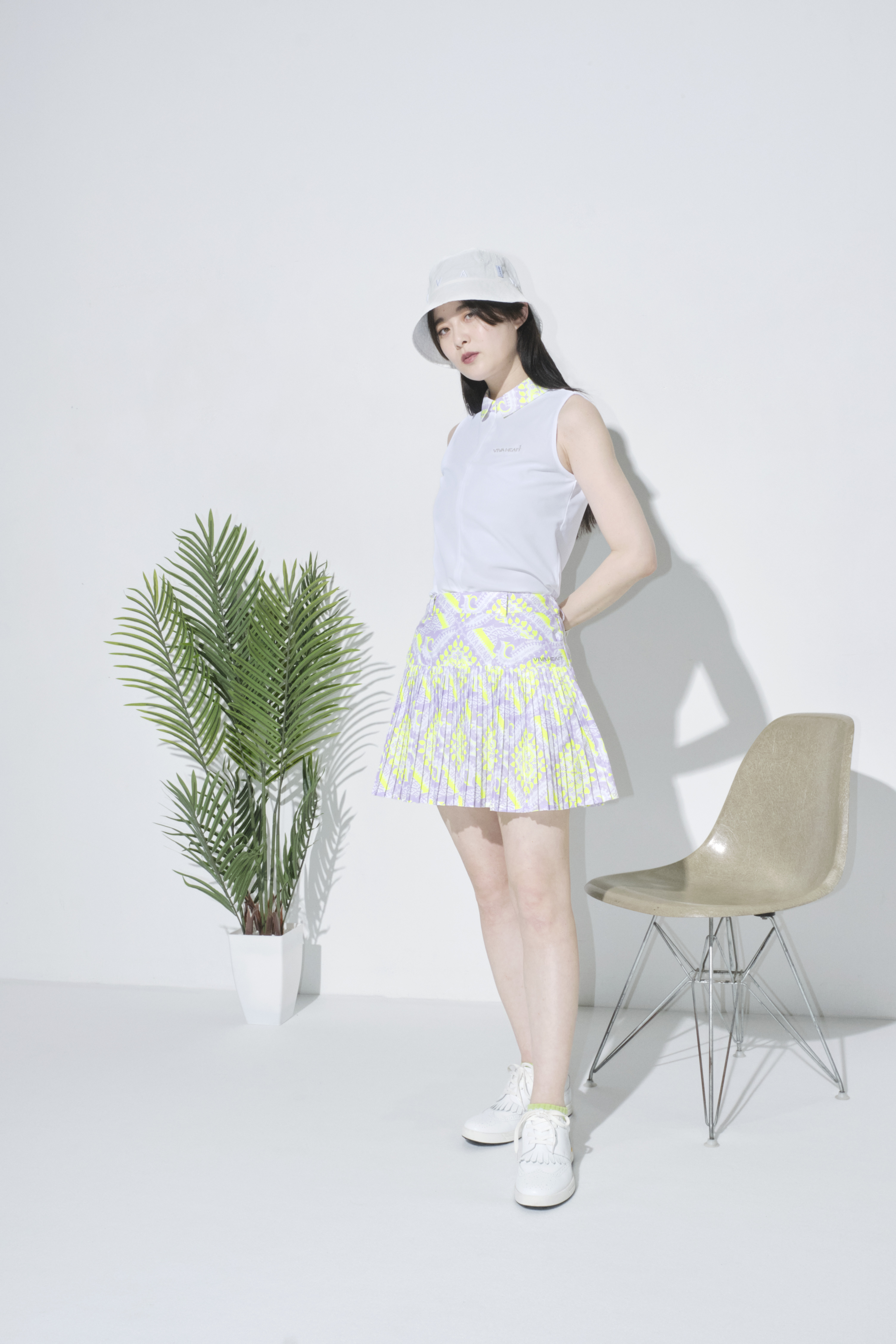 マジョリカスカーフ柄を襟とスカートに取り入れたスタイリング。スカートは腰回りがすっきりしたタイトなサイズ感で、ヒップラインから動きのある細プリーツがエレガントな印象に。