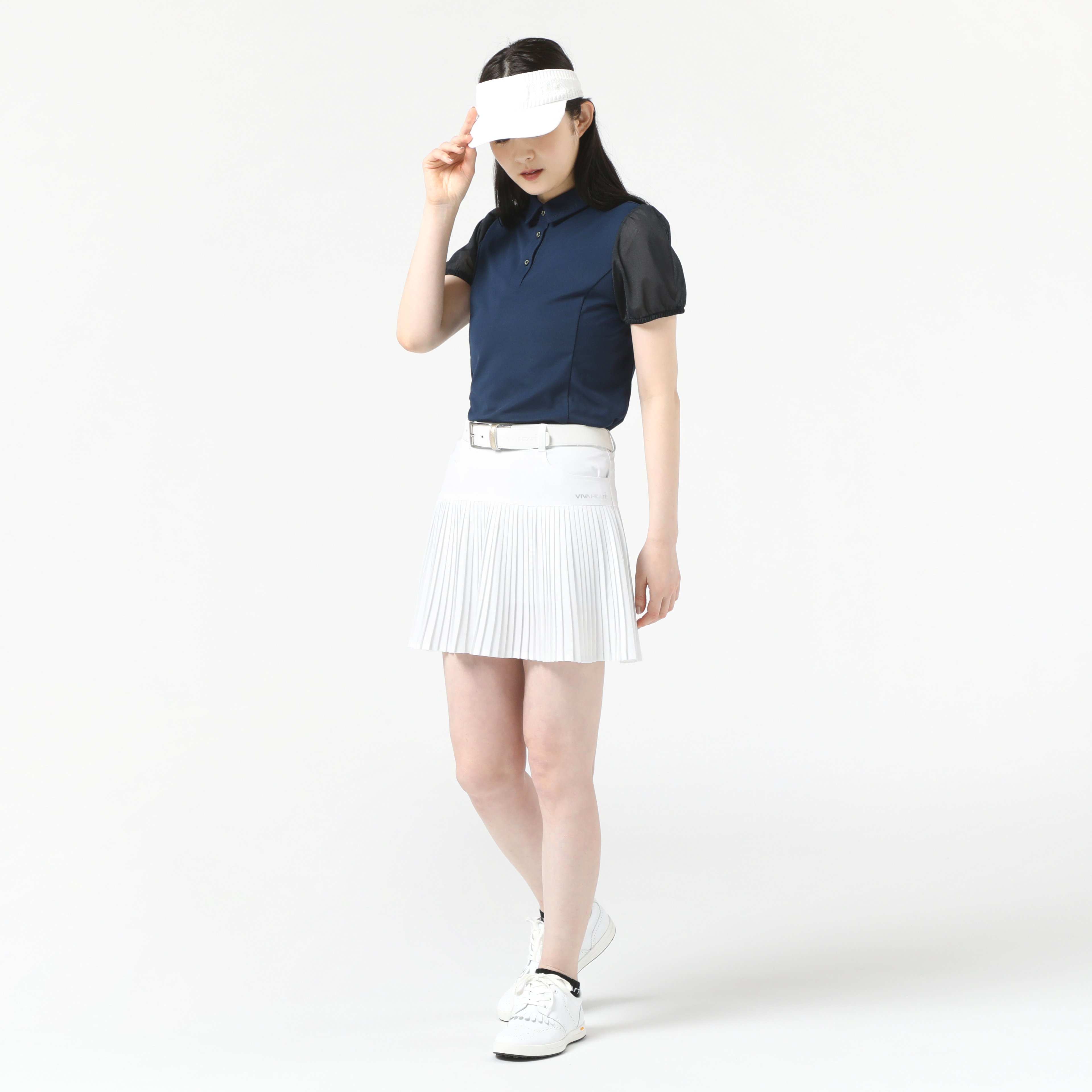 ネイビーとホワイトのマリン感漂う夏のコーデ。トップスの袖がシースルーデザインでより清涼感ある印象に。ボトムスは腰回りがタイトなサイズ感で、ヒップラインから動きのある細プリーツデザイン。