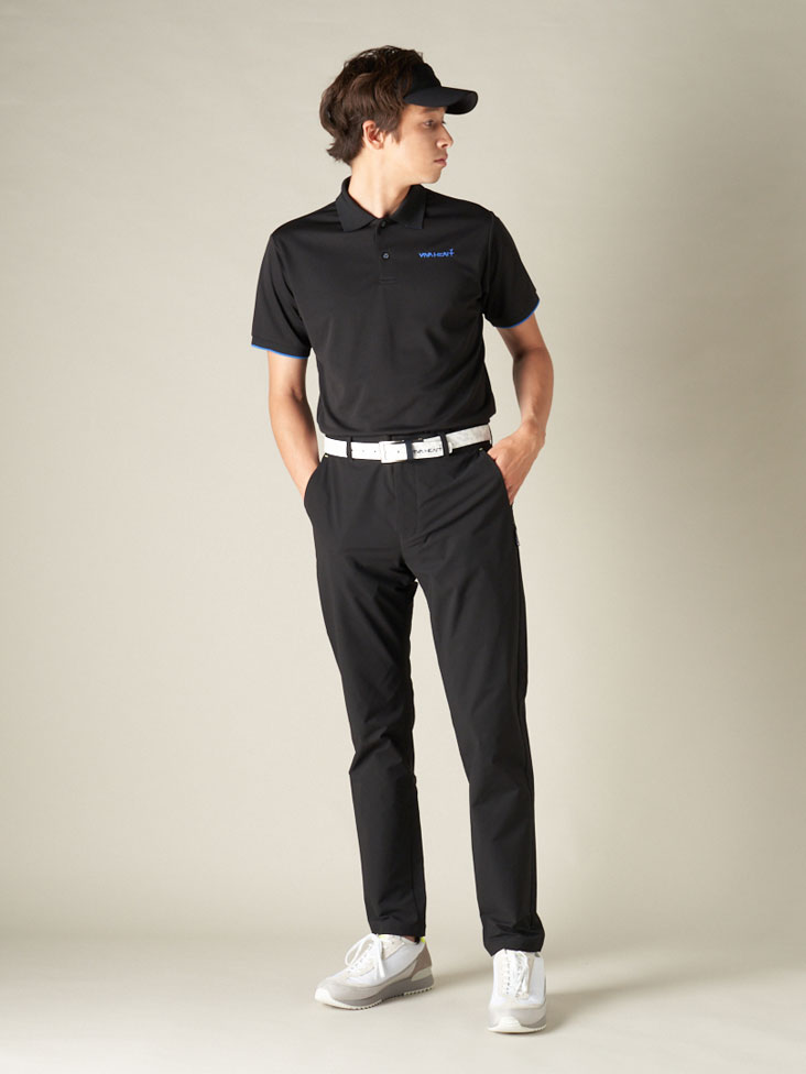 上下ブラックのスタイリングに、トップスの衿裏と袖口、胸元ロゴのブルーが映えます。またホワイトのベルトを挟むことで爽やかな印象に。秋とはいえ、まだまだ暑さが残る中吸水速乾機能付きのパンツがオススメです。