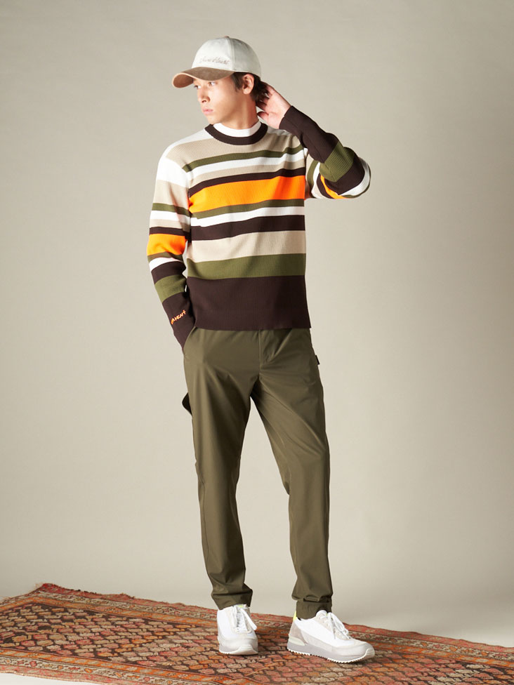秋に身につけたいカーキでまとめたスタイリング。温かみのあるオレンジがより秋っぽさを感じさせます。軽量なポリエステル素材を使用しているのでニットでも動きやすく、スウィングの邪魔をしません。パンツはナイロン独特のソフトな手触り。適度なテーパードシルエットでリラックスして着用頂けます。