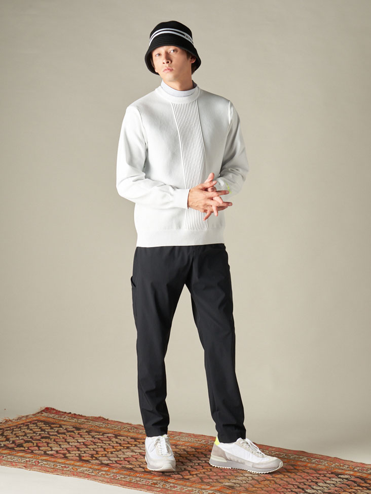 ブラック×ホワイトのクールなスタイリング。ジャガードで凹凸感を表現したニットは後ろ側は斜めにラインとロゴの入っており、一見クールな組み合わせも、後ろ側から見れば遊び心のあるスタイリングに。やや深めのバケットハットは編み込みのニットでゴルフ以外にもお使い頂けるアイテムです。