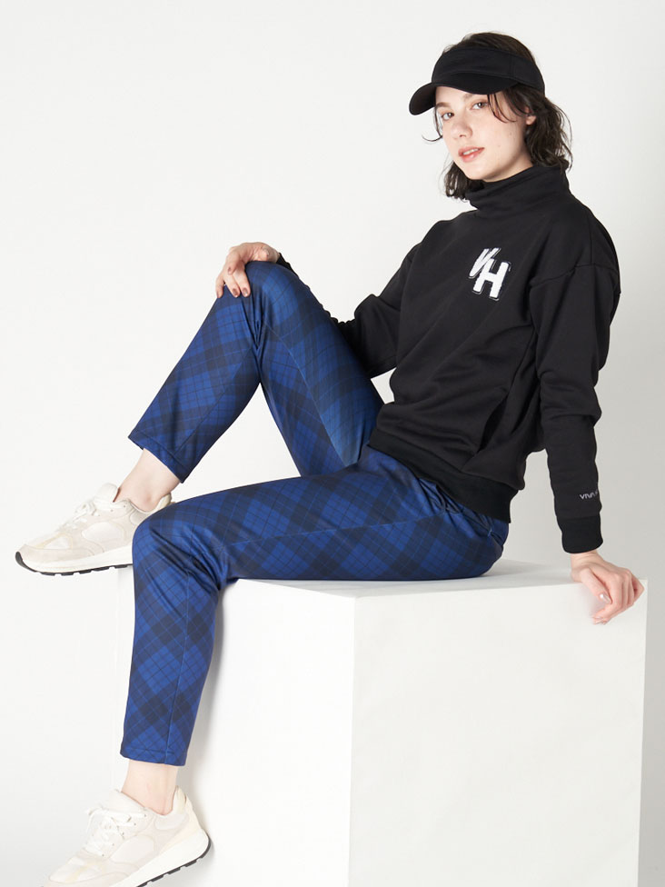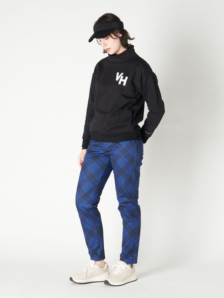 胸のVHロゴとチェックパンツで、ブルー×ブラックのクールな組み合わせにポップさを少しプラスしたスタイリング。トップス・パンツ共に裏面は暖かく肌触りの良い素材を使用しているので、アウターを着なくても楽しめるアイテムになっています。